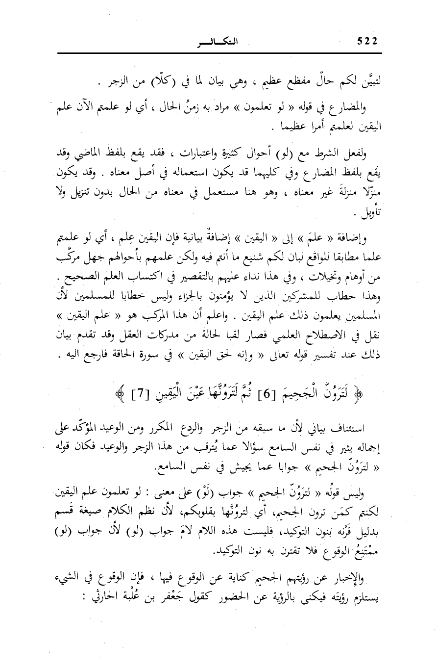 وَلَيْسَ قَوْلُهُ: لَتَرَوُنَّ الْجَحِيمَ جَوَابَ (لَوْ) عَلَى مَعْنَى: لَوْ تَعْلَمُونَ عِلْمَ الْيَقِينِ لَكُنْتُمْ كَمَنْ تَرَوْنَ الْجَحِيمَ، أَيْ لَتَرْوُنَّهَا بِقُلُوبِكُمْ، لِأَنَّ نَظْمَ الْكَلَامِ صِيغَةُ قَسَمٍ بِدَلِيلِ قَرْنِهِ بِنُونِ التَّوْكِيدِ، فَلَيْسَتْ هَذِهِ اللَّامُ لَامَ جَوَابِ (لَوْ) لِأَنَّ جَوَابَ (لَوْ) مُمْتَنِعُ الْوُقُوعِ فَلَا تَقْتَرِنُ بِهِ نُونُ التَّوْكِيدِ.