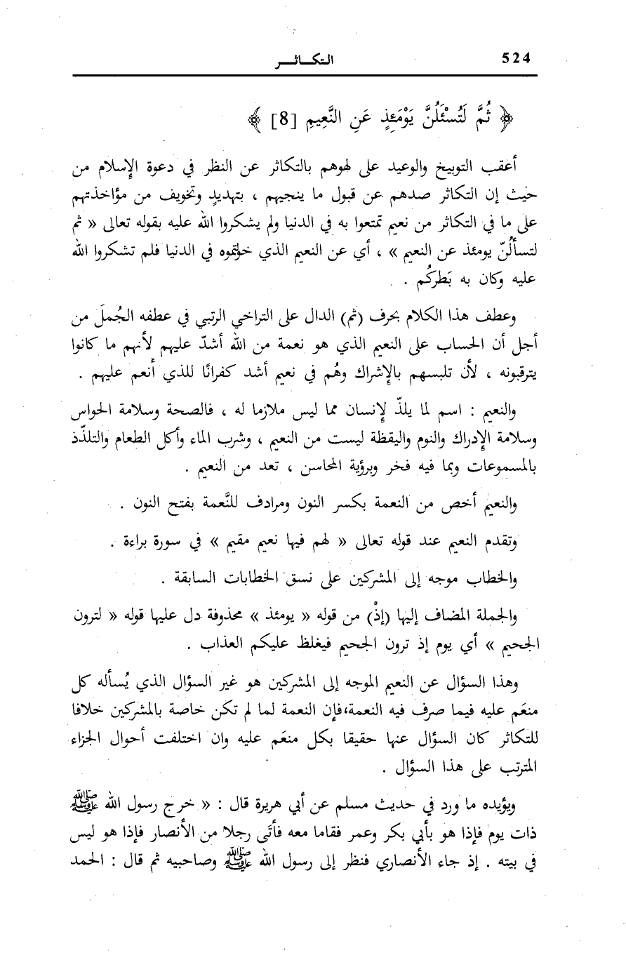 أَعْقَبَ التَّوْبِيخَ وَالْوَعِيدَ عَلَى لَهْوِهِمْ بِالتَّكَاثُرِ عَنِ النَّظَرِ فِي دَعْوَةِ الْإِسْلَامِ مِنْ حَيْثُ إِنَّ التَّكَاثُرَ صَدَّهُمْ عَنْ قَبُولِ مَا يُنْجِيهِمْ، بِتَهْدِيدٍ وَتَخْوِيفٍ مِنْ مُؤَاخَذَتِهِمْ عَلَى مَا فِي التَّكَاثُرِ مِنْ نَعِيمٍ تَمَتَّعُوا بِهِ فِي الدُّنْيَا وَلَمْ يَشْكُرُوا اللَّهَ عَلَيْهِ بِقَوْلِهِ تَعَالَى: ثُمَّ لَتُسْئَلُنَّ يَوْمَئِذٍ عَنِ النَّعِيمِ، أَيْ عَنِ النَّعِيمِ الَّذِي خُوَّلْتُمُوهُ فِي الدُّنْيَا فَلَمْ تَشْكُرُوا اللَّهَ عَلَيْهِ وَكَانَ بِهِ بَطَرُكُمْ.