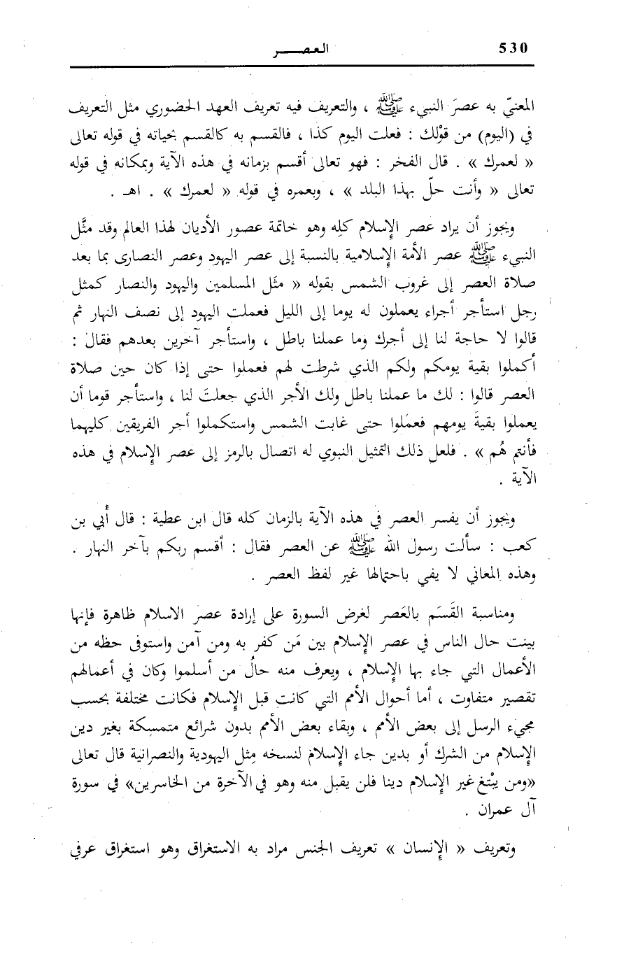 وَيَجُوزُ أَنْ يُرَادَ عَصْرُ الْإِسْلَامِ كُلُّهُ وَهُوَ خَاتِمَةُ عُصُورِ الْأَدْيَانِ لِهَذَا الْعَالَمِ وَقَدْ مَثَّلَ النَّبِيءُ صَلَّى اللهُ عَلَيْهِ وَسَلَّمَ عَصْرَ الْأُمَّةِ الْإِسْلَامِيَّةِ بِالنِّسْبَةِ إِلَى عَصْرِ الْيَهُودِ وَعَصْرِ النَّصَارَى بِمَا بَعْدَ صَلَاةِ الْعَصْرِ إِلَى غُرُوبِ الشَّمْسِ