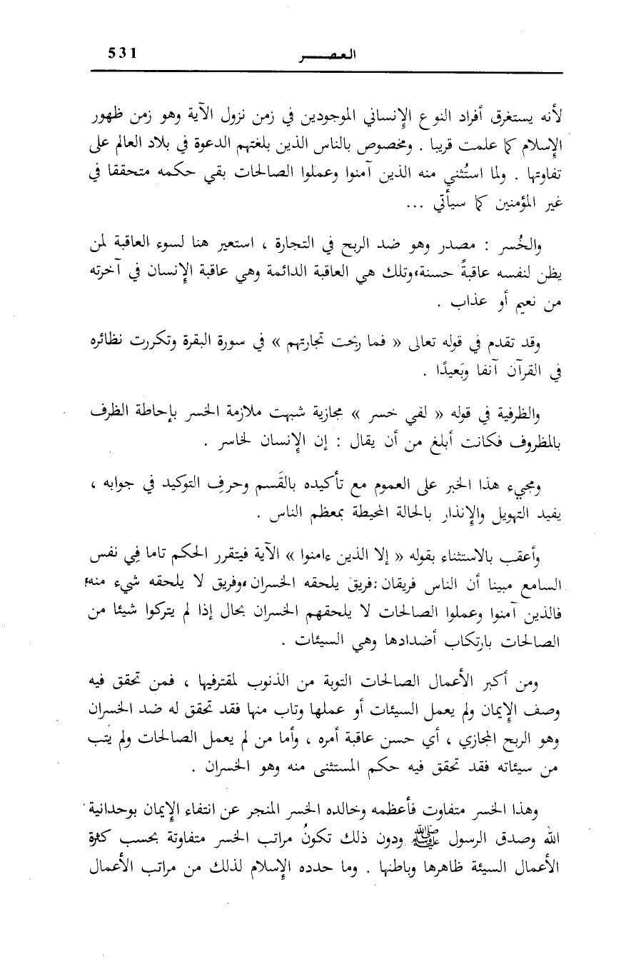 وَأَعْقَبَ بِالِاسْتِثْنَاءِ بِقَوْلِهِ: إِلَّا الَّذِينَ آمَنُوا الْآيَةَ فيتقرر الحكم تَاما فِي نَفْسِ السَّامِعِ مُبَيِّنًا أَنَّ النَّاسَ فَرِيقَانِ: فَرِيقٌ يَلْحَقُهُ الْخُسْرَانُ، وَفَرِيقٌ لَا يَلْحَقُهُ شَيْءٌ مِنْهُ، فَالَّذِينَ آمَنُوا وَعَمِلُوا الصَّالِحَاتِ لَا يَلْحَقُهُمْ الْخُسْرَانُ بِحَالٍ إِذَا لَمْ يَتْرُكُوا شَيْئًا مِنَ الصَّالِحَاتِ بِارْتِكَابِ أَضْدَادِهَا وَهِيَ السَّيِّئَاتُ.
