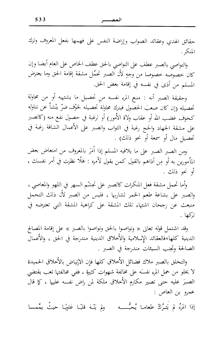 وَقل اشْتَمَلَ قَوْلُهُ تَعَالَى: وَتَواصَوْا بِالْحَقِّ وَتَواصَوْا بِالصَّبْرِ عَلَى إِقَامَةِ الْمَصَالِحِ الدِّينِيَّةِ كُلِّهَا، فَالْعَقَائِدُ الْإِسْلَامِيَّةُ وَالْأَخْلَاقُ الدِّينِيَّةُ مُنْدَرِجَةٌ فِي الْحَقِّ، وَالْأَعْمَالُ الصَّالِحَةُ وَتَجَنُّبُ السَّيِّئَاتِ مُنْدَرِجَةٌ فِي الصَّبْرِ.