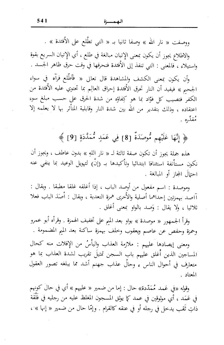 هَذِهِ جُمْلَةٌ يَجُوزُ أَنْ تَكُونَ صِفَةً ثَالِثَةً لِ نارُ اللَّهِ [الْهمزَة: 6] بِدُونِ عَاطِفٍ، وَيَجُوزُ أَنْ تَكُونَ مُسْتَأْنَفَةً اسْتِئْنَافًا ابْتِدَائِيًّا وَتَأْكِيدُهَا بِ (إِنَّ) لِتَهْوِيلِ الْوَعِيدِ بِمَا يَنْفِي عَنْهُ احْتِمَالَ الْمَجَازِ أَوِ الْمُبَالَغَةِ.