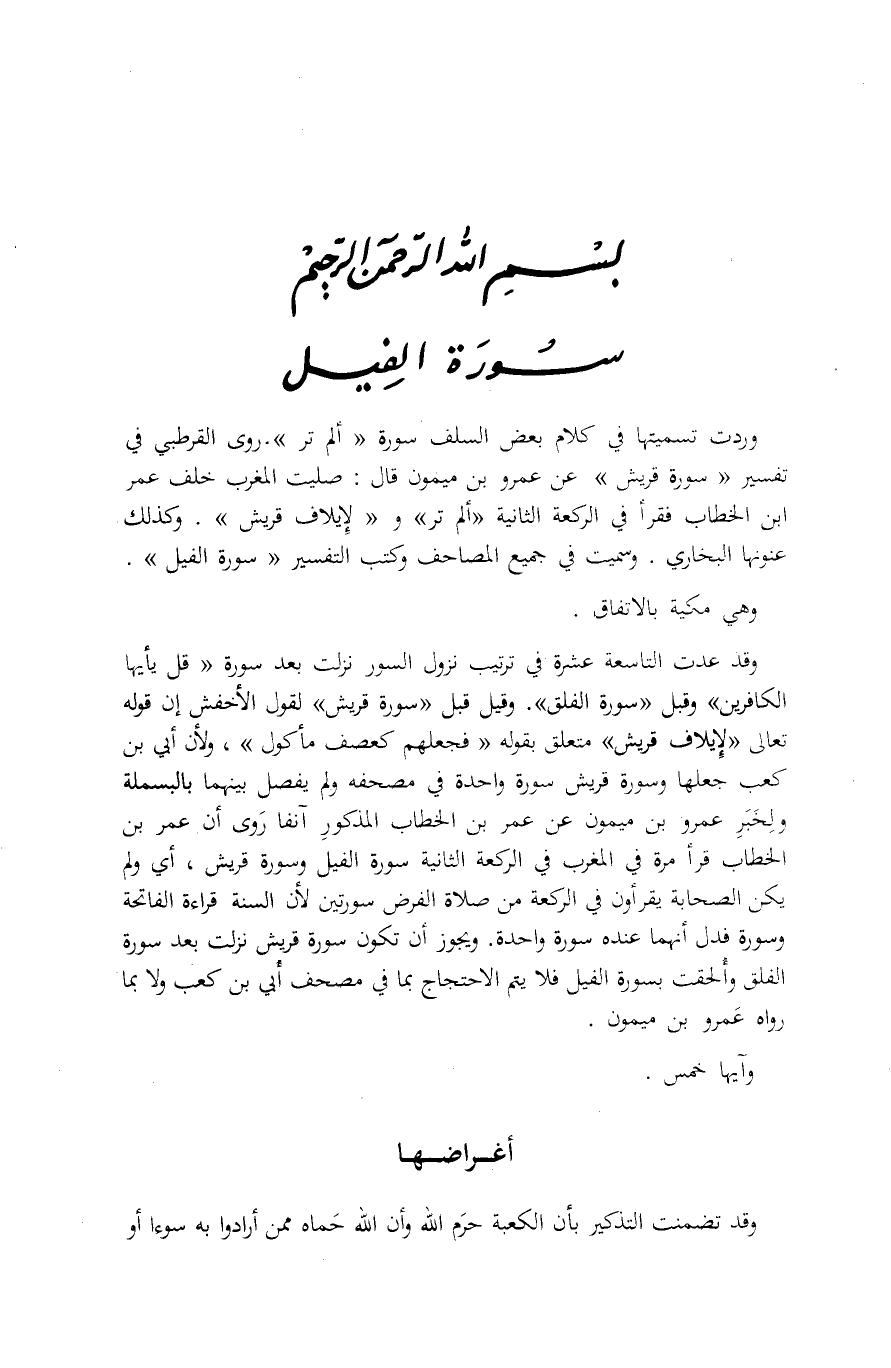 لِإِيلافِ قُرَيْشٍ [قُرَيْشٍ: 1] مُتَعَلِّقٌ بِقَوْلِهِ: فَجَعَلَهُمْ كَعَصْفٍ مَأْكُولٍ [الْفِيل: 5] ، وَلِأَنَّ أُبِيَّ بْنَ كَعْبٍ جَعَلَهَا وَسُورَةَ قُرَيْشٍ سُورَةً وَاحِدَةً فِي مُصْحَفِهِ وَلَمْ يَفْصِلْ بَيْنَهُمَا بِالْبَسْمَلَةِ وَلِخَبَرِ عَمْرِو بْنِ مَيْمُونٍ عَنْ عُمَرَ بْنِ الْخَطَّابِ الْمَذْكُورِ آنِفًا رَوَى أَنَّ عُمَرَ بْنَ الْخَطَّابِ قَرَأَ مَرَّةً فِي الْمَغْرِبِ فِي الرَّكْعَةِ الثَّانِيَةِ سُورَةَ الْفِيلِ وَسُورَةَ قُرَيْشٍ، أَيْ وَلَمْ يكن الصَّحَابَة يقرأون فِي الرَّكْعَةِ مِنْ صَلَاةِ الْفَرْضِ سُورَتَيْنِ لِأَنَّ السُّنَّةَ قِرَاءَةُ الْفَاتِحَةِ وَسُورَةٍ فَدَلَّ أَنَّهُمَا عِنْدَهُ سُورَةٌ وَاحِدَةٌ. وَيَجُوزُ أَنْ تَكُونَ سُورَةُ قُرَيْشٍ نَزَلَتْ بَعْدَ سُورَةِ الْفَلَقِ وَأُلْحِقَتْ بِسُورَةِ الْفِيلِ فَلَا يَتِمُّ الِاحْتِجَاجُ بِمَا فِي مُصْحَفِ أُبِيِّ بْنِ كَعْبٍ وَلَا بِمَا رَوَاهُ عَمْرُو بْنُ مَيْمُونٍ.