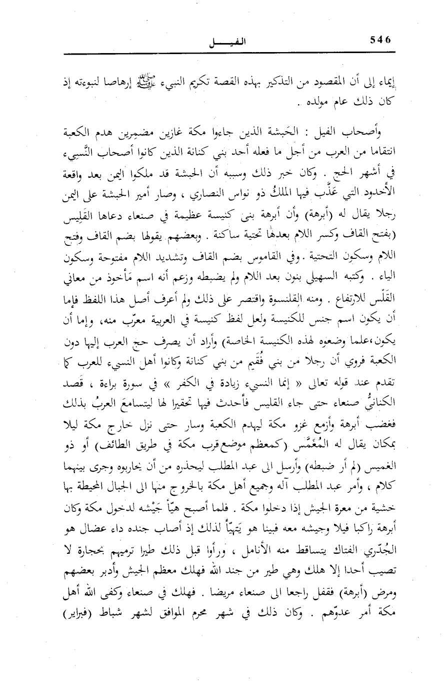 وَبَعْضُهُمْ يَقُولُهَا بِضَمِّ الْقَافِ وَفَتْحِ اللَّامِ وَسُكُونِ التَّحْتِيَّةِ) . وَفِي «الْقَامُوسِ» بِضَمِّ الْقَافِ وَتَشْدِيدِ اللَّامِ مَفْتُوحَةً وَسُكُونِ الْيَاءِ. وَكَتَبَهُ السُّهَيْلِيُّ بِنُونٍ بَعْدَ اللَّامِ وَلَمْ يَضْبُطْهُ وَزَعَمَ أَنَّهُ اسْمٌ مَأْخُوذٌ مِنْ مَعَانِي الْقَلْسِ لِلِارْتِفَاعِ. وَمِنْهُ الْقَلَنْسُوَةُ وَاقْتَصَرَ عَلَى ذَلِكَ وَلَمْ أَعْرِفْ أَصْلَ هَذَا اللَّفْظِ فَإِمَّا أَنْ يَكُونَ اسْمَ جِنْسٍ لِلْكَنِيسَةِ وَلَعَلَّ لَفْظَ كَنِيسَةٍ فِي الْعَرَبِيَّةِ مُعْرَّبٌ مِنْهُ، وَإِمَّا أَنْ يَكُونَ عَلَمًا وَضَعُوهُ لِهَذِهِ الْكَنِيسَةِ الْخَاصَّةِ وَأَرَادَ أَنْ يَصْرِفَ حَجَّ الْعَرَبِ إِلَيْهَا دُونَ الْكَعْبَةِ فَرُوِيَ أَنَّ رَجُلًا مِنْ بَنِي فُقَيْمٍ مِنْ بَنِي كِنَانَةَ وَكَانُوا أَهْلَ النَّسِيءِ لِلْعَرَبِ كَمَا تَقَدَّمَ عِنْدَ قَوْلِهِ تَعَالَى: إِنَّمَا النَّسِيءُ زِيادَةٌ فِي الْكُفْرِ فِي سُورَةِ بَرَاءَةَ [37] ، قَصَدَ الْكِنَانِيُّ صَنْعَاءَ حَتَّى جَاءَ الْقَلِيسَ فَأَحْدَثَ فِيهَا تَحْقِيرًا لَهَا لِيَتَسَامَعَ الْعَرَبُ بِذَلِكَ فَغَضِبَ أَبْرَهَةُ وَأَزْمَعَ غَزْوَ مَكَّةَ لِيَهْدِمَ الْكَعْبَةَ وَسَارَ حَتَّى نَزَلَ خَارِجَ مَكَّةَ لَيْلًا بِمَكَانٍ يُقَالُ لَهُ الْمُغَمَّسُ (كَمُعَظَّمٍ مَوْضِعٌ قُرْبَ مَكَّةَ فِي طَرِيقِ الطَّائِفِ) أَوْ ذُو الْغَمِيسِ (لَمْ أَرَ ضَبْطَهُ) وَأَرْسَلَ إِلَى عَبَدِ الْمُطَّلِبِ لِيُحَذِّرَهُ مِنْ أَنْ يُحَارِبُوهُ وَجَرَى بَيْنَهُمَا كَلَامٌ، وَأَمَرَ عَبْدُ الْمُطَّلِبِ آلَهُ وَجَمِيعَ أَهْلِ مَكَّةَ بِالْخُرُوجِ مِنْهَا إِلَى الْجِبَالِ الْمُحِيطَةِ بِهَا خَشْيَةً مِنْ مَعَرَّةِ الْجَيْشِ إِذَا دَخَلُوا مَكَّةَ. فَلَمَّا أَصْبَحَ هَيَّأَ جَيْشَهُ لِدُخُولِ مَكَّةَ وَكَانَ أَبْرَهَةُ رَاكِبًا فِيلًا وَجَيْشُهُ مَعَهُ فَبَيْنَا هُوَ يَتَهَيَّأُ لِذَلِكَ إِذْ أَصَابَ جُنْدَهُ دَاءٌ عُضَالٌ هُوَ الْجُدَرِيُّ الْفَتَّاكُ يَتَسَاقَطُ مِنْهُ الْأَنَامِلُ، وَرَأَوْا قَبْلَ ذَلِكَ طَيْرًا تَرْمِيهِمْ بِحِجَارَةٍ لَا تُصِيبُ أَحَدًا إِلَّا هَلَكَ وَهِيَ طَيْرٌ مِنْ جُنْدِ اللَّهِ فَهَلَكَ مُعْظَمُ الْجَيْشِ وَأَدْبَرَ بَعْضُهُمْ وَمَرِضَ (أَبْرَهَةُ) فَقَفَلَ رَاجِعًا إِلَى صَنْعَاءَ مَرِيضًا، فَهَلَكَ فِي صَنْعَاءَ وَكَفَى اللَّهُ أَهْلَ مَكَّةَ أَمْرَ عَدُوِّهِمْ. وَكَانَ ذَلِكَ فِي شَهْرِ مُحَرَّمٍ الْمُوَافِقِ لِشَهْرِ شُبَاطَ (فِبْرَايِرَ)