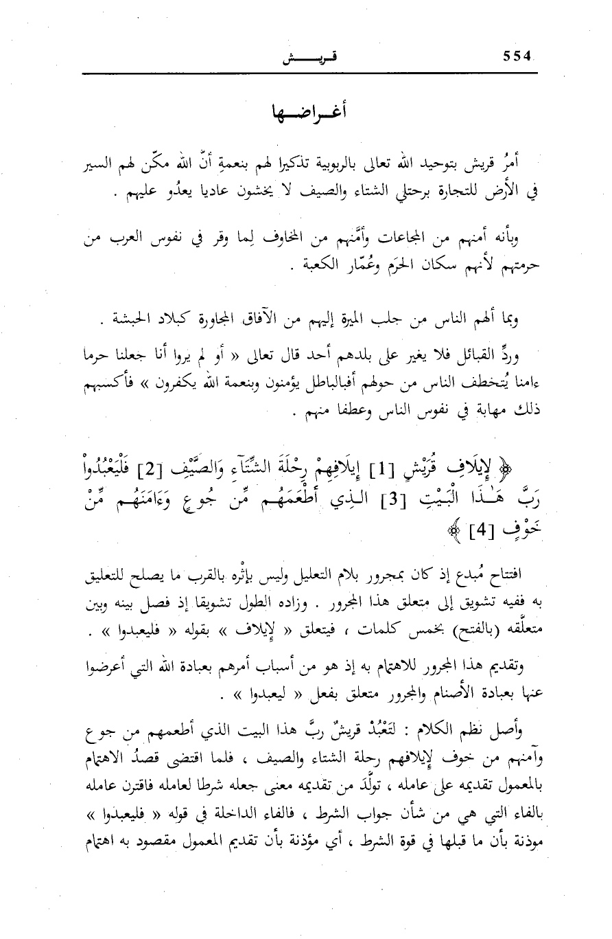 لِإِيلافِ قُرَيْشٍ (1) إِيلافِهِمْ رِحْلَةَ الشِّتاءِ وَالصَّيْفِ (2) فَلْيَعْبُدُوا رَبَّ هذَا الْبَيْتِ (3) الَّذِي أَطْعَمَهُمْ مِنْ جُوعٍ وَآمَنَهُمْ مِنْ خَوْفٍ (4)