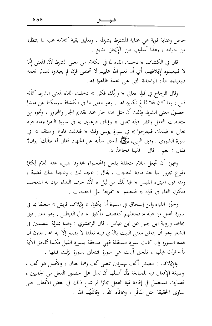 قَالَ فِي «الْكَشَّافِ» : دَخَلَتِ الْفَاءُ لِمَا فِي الْكَلَامِ مِنْ مَعْنَى الشَّرْطِ لِأَنَّ الْمَعْنَى إِمَّا لَا فَلْيَعْبُدُوهُ لِإِيلَافِهِمْ، أَيْ أَنَّ نِعَمَ اللَّهِ عَلَيْهِمْ لَا تُحْصَى فَإِنْ لَمْ يَعْبُدُوهُ لِسَائِرِ نِعَمِهِ فَلْيَعْبُدُوهُ لِهَذِهِ الْوَاحِدَةِ الَّتِي هِيَ نِعْمَةٌ ظَاهِرَةٌ اهـ.