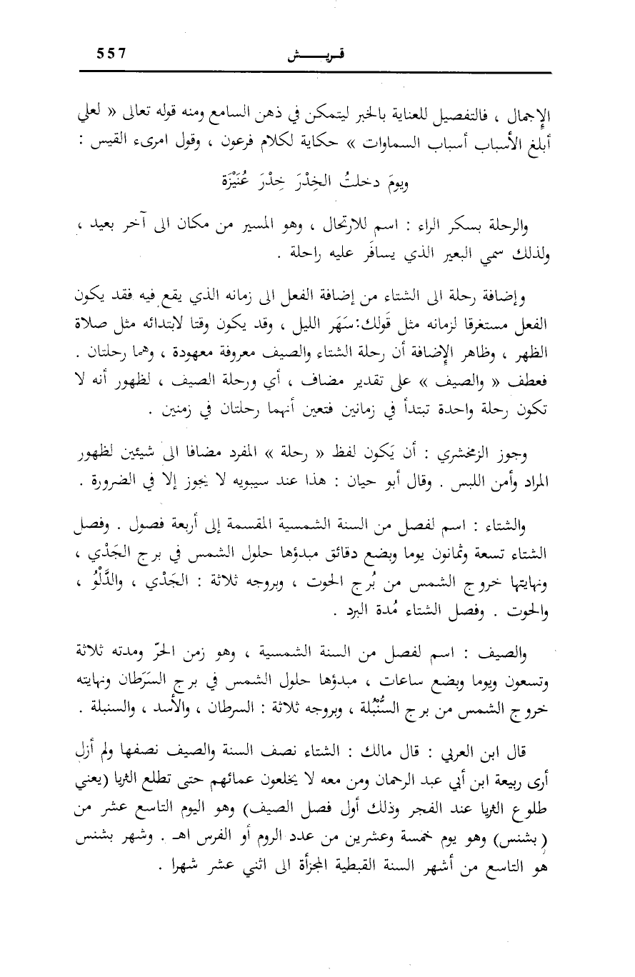 وَإِضَافَةُ رِحْلَةٍ إِلَى الشِّتَاءِ مِنْ إِضَافَةِ الْفِعْلِ إِلَى زَمَانِهِ الَّذِي يَقَعُ فِيهِ فَقَدْ يَكُونُ الْفِعْلُ مُسْتَغْرِقًا لِزَمَانِهِ مِثْلَ قَوْلِكَ: سَهَرُ اللَّيْلِ، وَقَدْ يَكُونُ وَقْتًا لِابْتِدَائِهِ مِثْلَ صَلَاةِ الظُّهْرِ، وَظَاهِرُ