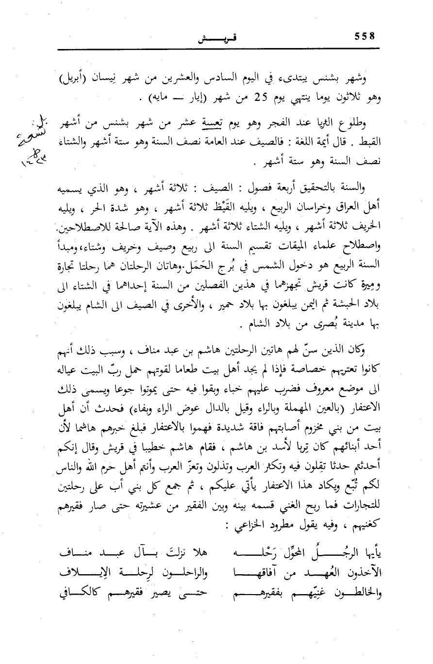 بُرْجِ الْحَمَلِ، وَهَاتَانِ الرحلتان هما رحلتا تِجَارَةٍ وَمِيرَةٍ كَانَتْ قُرَيْشٌ تُجَهِّزُهُمَا فِي هَذَيْنِ الْفَصْلَيْنِ مِنَ السَّنَةِ إِحْدَاهُمَا فِي الشِّتَاءِ إِلَى بِلَادِ الْحَبَشَةِ ثُمَّ الْيَمَنِ يَبْلُغُونَ بِهَا بِلَادَ حِمْيَرَ، وَالْأُخْرَى فِي الصَّيْفِ إِلَى الشَّامِ يَبْلُغُونَ بِهَا مَدِينَةَ بُصْرَى مِنْ بِلَادِ الشَّامِ.