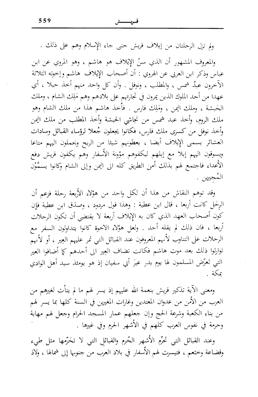 وَعِنْدَ الْقَبَائِلِ الَّتِي تُحَرِّمُ الْأَشْهُرَ الْحُرُمَ وَالْقَبَائِلِ الَّتِي لَا تُحَرِّمُهَا مِثْلَ طَيِّءٍ وَقُضَاعَةَ وَخَثْعَمَ، فَتَيَسَّرَتْ لَهُمُ الْأَسْفَارُ فِي بِلَادِ الْعَرَبِ مِنْ جَنُوبِهَا إِلَى شَمَالِهَا، وَلَاذَ