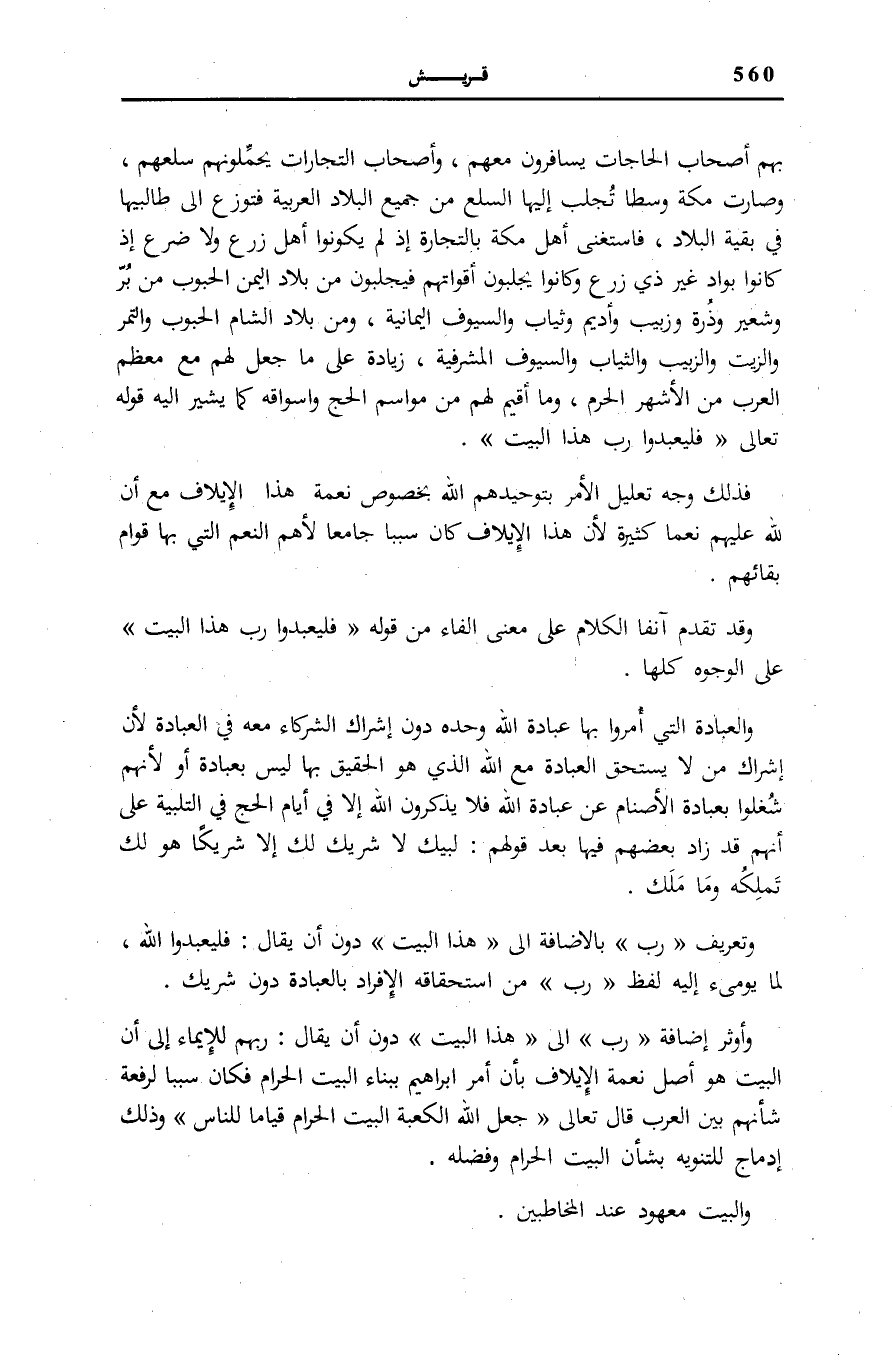 بِهِمْ أَصْحَابُ الْحَاجَاتِ يُسَافِرُونَ مَعَهُمْ، وَأَصْحَابُ التِّجَارَاتِ يُحَمِّلُونَهُمْ سِلَعَهُمْ، وَصَارَتْ مَكَّةُ وَسَطًا تُجْلَبُ إِلَيْهَا السِّلَعُ مِنْ جَمِيعِ الْبِلَادِ الْعَرَبِيَّةِ فَتُوَزَّعُ إِلَى طَالِبِيهَا فِي بَقِيَّةِ الْبِلَادِ، فَاسْتَغْنَى أَهْلُ مَكَّةَ بِالتِّجَارَةِ إِذْ لَمْ يَكُونُوا أَهْلَ زَرْعٍ وَلَا ضَرْعٍ إِذْ كَانُوا بِوَادٍ غَيْرِ ذِي زَرْعٍ وَكَانُوا يَجْلِبُونَ أَقْوَاتَهُمْ فَيَجْلِبُونَ مِنْ بِلَادِ الْيَمَنِ الْحُبُوبَ مِنْ بُرٍّ وَشَعِيرٍ وَذُرَةٍ وَزَبِيبٍ وَأَدِيمٍ وَثِيَابٍ وَالسُّيُوفَ الْيَمَانِيَّةَ، وَمِنْ بِلَادِ الشَّامِ الْحُبُوبَ وَالتَّمْرَ وَالزَّيْتَ وَالزَّبِيبَ وَالثِّيَابَ وَالسُّيُوفَ الْمَشْرَفِيَّةَ، زِيَادَةً عَلَى مَا جُعِلَ لَهُمْ مَعَ مُعْظَمِ الْعَرَبِ مِنَ الْأَشْهُرِ الْحُرُمِ، وَمَا أُقِيمَ لَهُمْ مِنْ مَوَاسِمِ الْحَجِّ وَأَسْوَاقِهِ كَمَا يُشِيرُ إِلَيْهِ قَوْله تَعَالَى: لْيَعْبُدُوا رَبَّ هذَا الْبَيْتِ