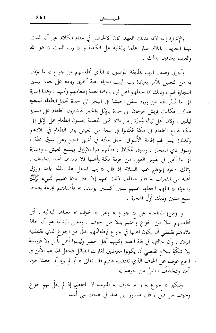 لِغَارَاتِ الْقَبَائِلِ فَجَعَلَ اللَّهُ لَهُمُ الْأَمْنَ فِي الْحَرَمِ عِوَضًا عَنِ الْخَوْفِ الَّذِي تَقْتَضِيهِ قِلَّتُهُمْ قَالَ تَعَالَى: أَوَلَمْ يَرَوْا أَنَّا جَعَلْنا حَرَماً آمِناً وَيُتَخَطَّفُ النَّاسُ مِنْ حَوْلِهِمْ [العنكبوت: 67] .