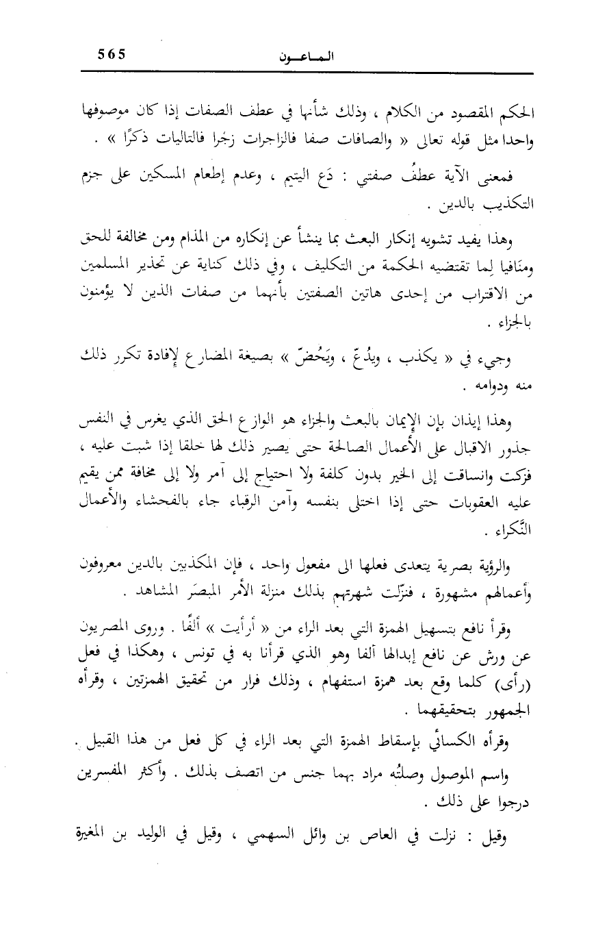وَقَرَأَهُ الْكِسَائِيُّ بِإِسْقَاطِ الْهَمْزَةِ الَّتِي بَعْدَ الرَّاءِ فِي كُلِّ فِعْلٍ مِنْ هَذَا الْقَبِيلِ. وَاسْمُ الْمَوْصُولِ وَصِلَتُهُ مُرَادٌ بِهِمَا جِنْسُ مَنِ اتَّصَفَ بِذَلِكَ. وَأَكْثَرُ الْمُفَسِّرِينَ دَرَجُوا عَلَى ذَلِكَ.