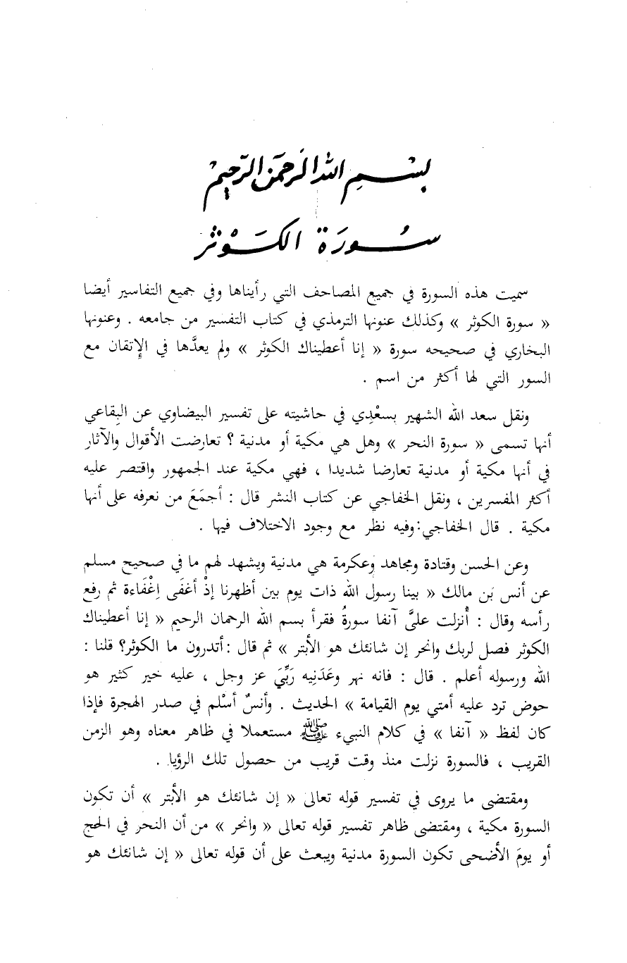 وَمُقْتَضَى مَا يُرْوَى فِي تَفْسِيرِ قَوْلِهِ تَعَالَى: إِنَّ شانِئَكَ هُوَ الْأَبْتَرُ أَنْ تَكُونَ السُّورَةُ مَكِّيَّةً، وَمُقْتَضَى ظَاهِرِ تَفْسِيرِ قَوْلِهِ تَعَالَى: وَانْحَرْ مِنْ أَنَّ النَّحْرَ فِي الْحَجِّ أَوْ يَوْمِ