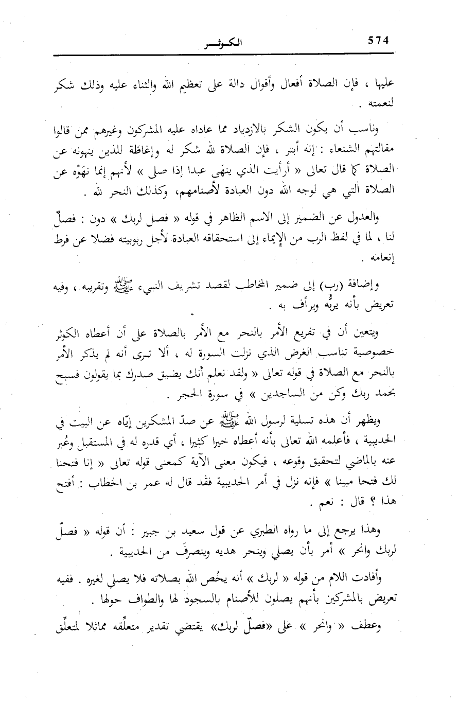 وَيَتَعَيَّنُ أَنَّ فِي تَفْرِيعِ الْأَمْرِ بِالنَّحْرِ مَعَ الْأَمْرِ بِالصَّلَاةِ عَلَى أَنْ أَعْطَاهُ الْكَوْثَرَ خُصُوصِيَّةً تُنَاسِبُ الْغَرَضَ الَّذِي نَزَلَتِ السُّورَةُ لَهُ، أَلَا تَرَى أَنَّهُ لَمْ يَذْكُرِ الْأَمْرَ بِالنَّحْرِ مَعَ الصَّلَاةِ فِي قَوْلِهِ تَعَالَى: وَلَقَدْ نَعْلَمُ أَنَّكَ يَضِيقُ صَدْرُكَ بِما يَقُولُونَ فَسَبِّحْ بِحَمْدِ رَبِّكَ وَكُنْ مِنَ السَّاجِدِينَ فِي سُورَةِ الْحِجْرِ [97، 98] .