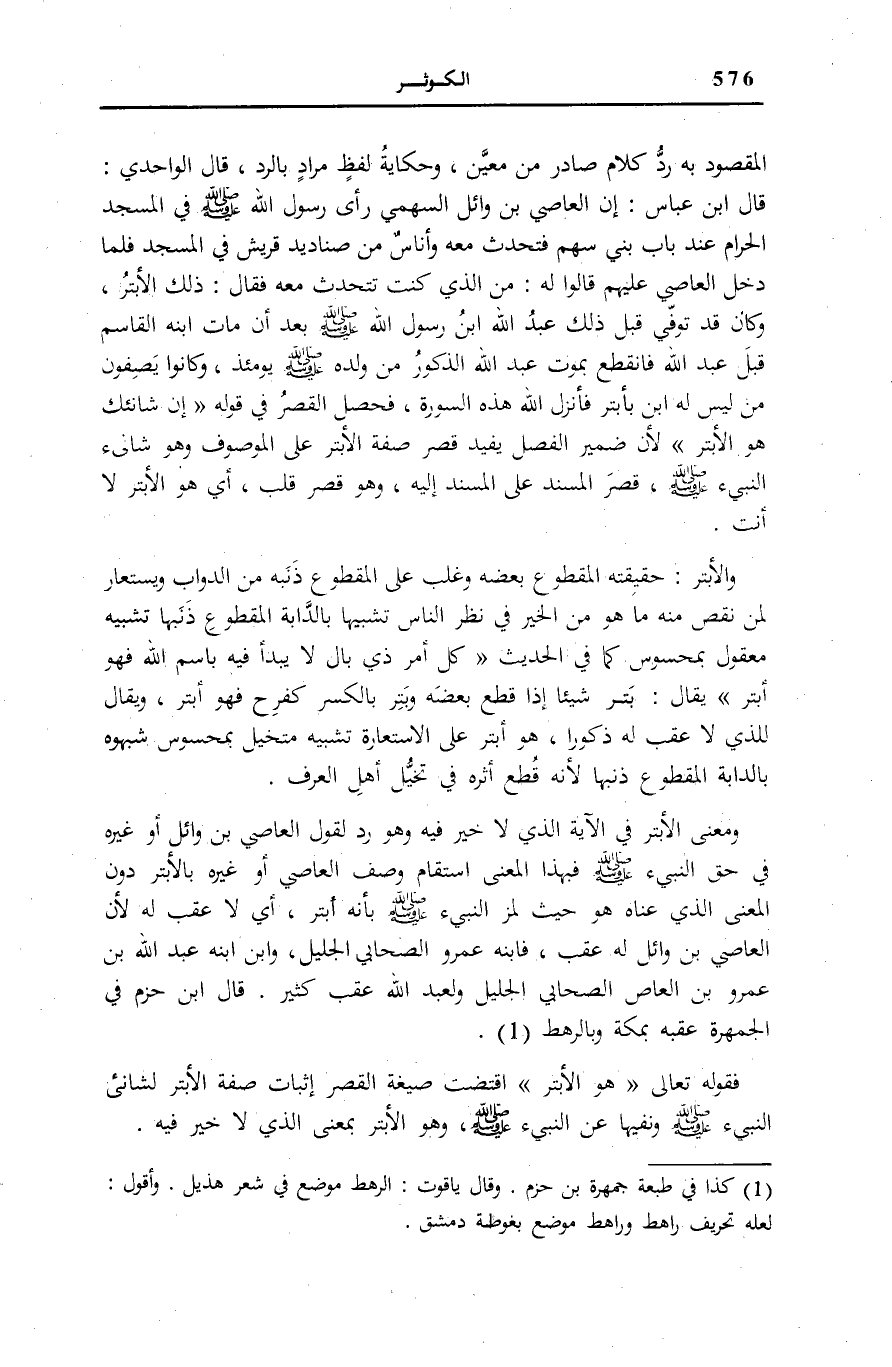 وَمَعْنَى الْأَبْتَرِ فِي الْآيَةِ الَّذِي لَا خَيْرَ فِيهِ وَهُوَ رَدٌّ لِقَوْلِ الْعَاصِي بْنِ وَائِلٍ أَوْ غَيْرِهِ فِي حَقِّ النَّبِيءِ صَلَّى اللهُ عَلَيْهِ وَسَلَّمَ فَبِهَذَا الْمَعْنَى اسْتَقَامَ وَصْفُ الْعَاصِي أَوْ غَيْرِهِ بِالْأَبْتَرِ دُونَ الْمَعْنَى الَّذِي عَنَاهُ هُوَ حَيْثُ لَمَزَ النَّبِيءَ صَلَّى اللهُ عَلَيْهِ وَسَلَّمَ بِأَنَّهُ أَبتر، أَي لاعقب لَهُ لِأَنَّ الْعَاصِيَ بْنَ وَائِلٍ لَهُ عَقِبٌ، فَابْنُهُ عَمْرٌو الصَّحَابِيُّ الْجَلِيلُ، وَابْنُ ابْنِهِ عَبْدُ اللَّهِ بْنِ عَمْرِو بْنِ الْعَاصِ الصَّحَابِيُّ الْجَلِيلُ وَلِعَبْدِ اللَّهِ عَقِبٌ كَثِيرٌ. قَالَ ابْنُ حَزْمٍ فِي «الْجَمْهَرَةِ» عَقِبُهُ بِمَكَّةَ وَبِالرَّهْطِ (¬1) .