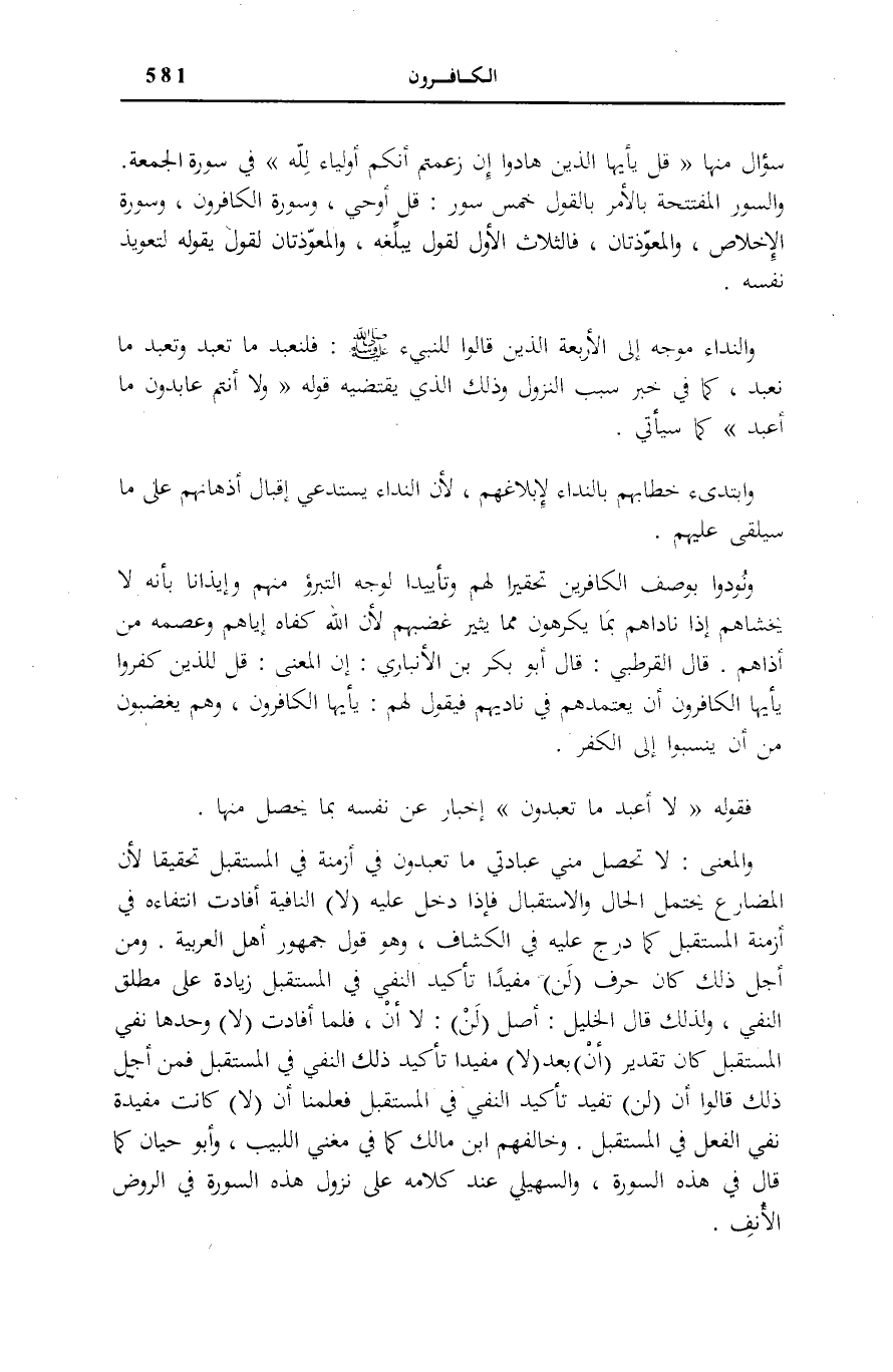 وَالْمَعْنَى: لَا تَحْصُلُ مِنِّي عِبَادَتِي مَا تَعْبُدُونَ فِي أَزْمِنَةٍ فِي الْمُسْتَقْبَلِ تَحْقِيقًا لِأَنَّ الْمُضَارِعَ يَحْتَمِلُ الْحَالَ وَالِاسْتِقْبَالَ فَإِذَا دَخَلَ عَلَيْهِ (لَا) النَّافِيَةُ أَفَادَتِ انْتِفَاءَهُ فِي أَزْمِنَةِ الْمُسْتَقْبَلِ كَمَا دَرَجَ عَلَيْهِ فِي «الْكَشَّافِ» ، وَهُوَ قَوْلُ جُمْهُورِ أَهْلِ الْعَرَبِيَّةِ. وَمِنْ أَجْلِ ذَلِكَ كَانَ حَرْفُ (لَنْ) مُفِيدًا تَأْكِيدَ النَّفْيِ فِي الْمُسْتَقْبَلِ زِيَادَة على مُطلق النَّفْيِ، وَلِذَلِكَ قَالَ الْخَلِيلُ: أَصْلُ (لَنْ) : لَا أَنْ، فَلَمَّا أَفَادَتْ (لَا) وَحْدَهَا نَفْيَ الْمُسْتَقْبَلِ كَانَ تَقْدِيرُ (أَنْ) بَعْدَ (لَا) مُفِيدًا تَأْكِيدَ ذَلِكَ النَّفْيِ فِي الْمُسْتَقْبَلِ فَمِنْ أَجْلِ ذَلِكَ قَالُوا إِنَّ (لَنْ) تُفِيدُ تَأْكِيدَ النَّفْيِ فِي الْمُسْتَقْبَلِ فَعَلِمْنَا أَنْ (لَا) كَانَتْ مُفِيدَةً نَفْيَ الْفِعْلِ فِي الْمُسْتَقْبَلِ. وَخَالَفَهُمُ ابْنُ مَالِكٍ كَمَا فِي «مُغَنِّي اللَّبِيبِ» ، وَأَبُو حَيَّانَ كَمَا قَالَ فِي هَذِهِ السُّورَةِ، وَالسُّهَيْلَيُّ عِنْدَ كَلَامِهِ عَلَى نُزُولِ هَذِهِ السُّورَةِ فِي «الرَّوْضِ الْأُنُفِ» .