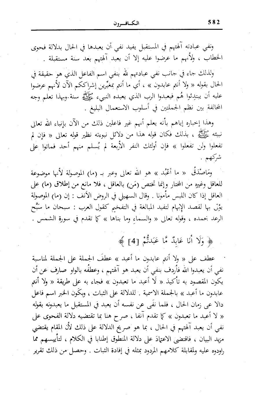 وَلِذَلِكَ جَاءَ فِي جَانِبِ نَفْيِ عِبَادَتِهِمْ لِلَّهِ بِنَفْيِ اسْمِ الْفَاعِلِ الَّذِي هُوَ حَقِيقَةٌ فِي الْحَالِ بِقَوْلِهِ: وَلا أَنْتُمْ عابِدُونَ، أَيْ مَا أَنْتُمْ بِمُغَيِّرِينَ إِشْرَاكَكُمُ الْآنَ لِأَنَّهُمْ عَرَضُوا عَلَيْهِ أَنْ يَبْتَدِئُوا هُمْ فَيَعْبُدُوا الرَّبَّ الَّذِي يَعْبُدُهُ النَّبِيءُ صَلَّى اللهُ عَلَيْهِ وَسَلَّمَ سَنَةً. وَبِهَذَا تَعْلَمُ وَجْهَ الْمُخَالَفَةِ بَيْنَ نَظْمِ الْجُمْلَتَيْنِ فِي أُسْلُوبِ الِاسْتِعْمَالِ الْبَلِيغِ.