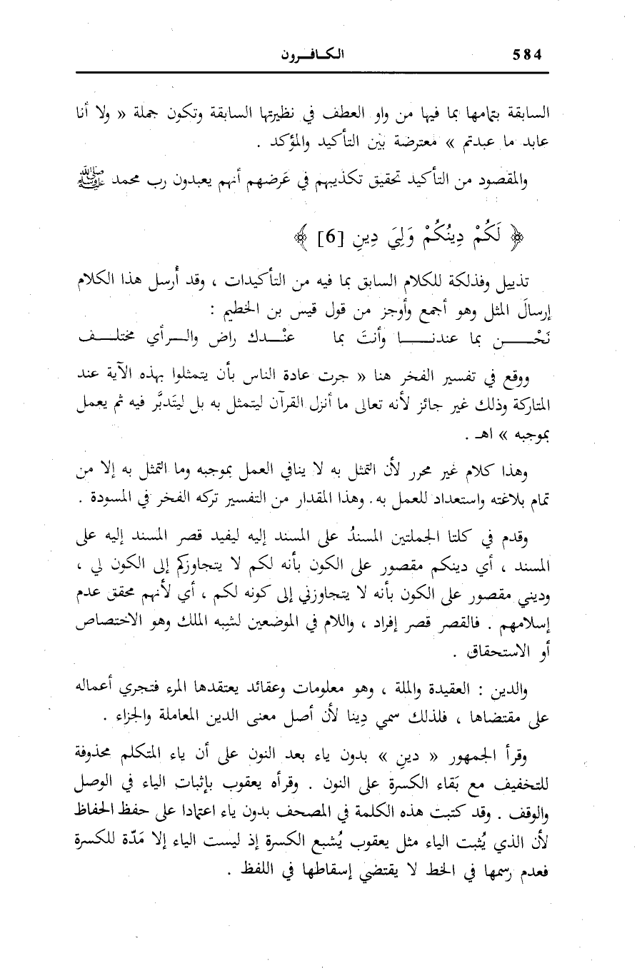 وَقُدِّمَ فِي كِلْتَا الْجُمْلَتَيْنِ الْمُسْنَدُ عَلَى الْمَسْنَدِ إِلَيْهِ لِيُفِيدَ قَصْرَ الْمُسْنَدِ إِلَيْهِ عَلَى الْمُسْنَدِ، أَيْ دِينُكُمْ مَقْصُورٌ عَلَى الْكَوْنِ بِأَنَّهُ لَكُمْ لَا يَتَجَاوَزُكُمْ إِلَى الْكَوْنِ لِي، وَدِينِي مَقْصُورٌ عَلَى الْكَوْنِ بِأَنَّهُ لَا يَتَجَاوَزُنِي إِلَى كَوْنِهِ لَكُمْ، أَيْ لِأَنَّهُمْ مُحَقَّقٌ عَدَمُ إِسْلَامِهِمْ. فَالْقَصْرُ قَصْرُ إِفْرَادٍ، وَاللَّامُ فِي الْمَوْضِعَيْنِ لِشِبْهِ الْمِلْكِ وَهُوَ الِاخْتِصَاصُ أَوِ الِاسْتِحْقَاقُ.