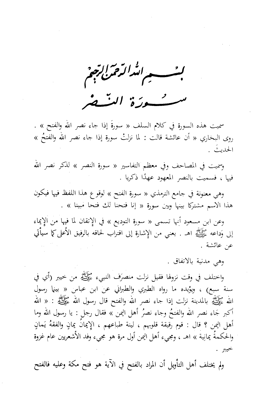 سُمِّيَتْ هَذِهِ السُّورَةُ فِي كَلَامِ السَّلَفِ «سُورَةَ إِذا جاءَ نَصْرُ اللَّهِ وَالْفَتْحُ رَوَى الْبُخَارِيُّ: «أَنَّ عَائِشَةَ قَالَتْ: لَمَّا نَزَلَتْ سُورَةُ إِذا جاءَ نَصْرُ اللَّهِ وَالْفَتْحُ الْحَدِيثَ.