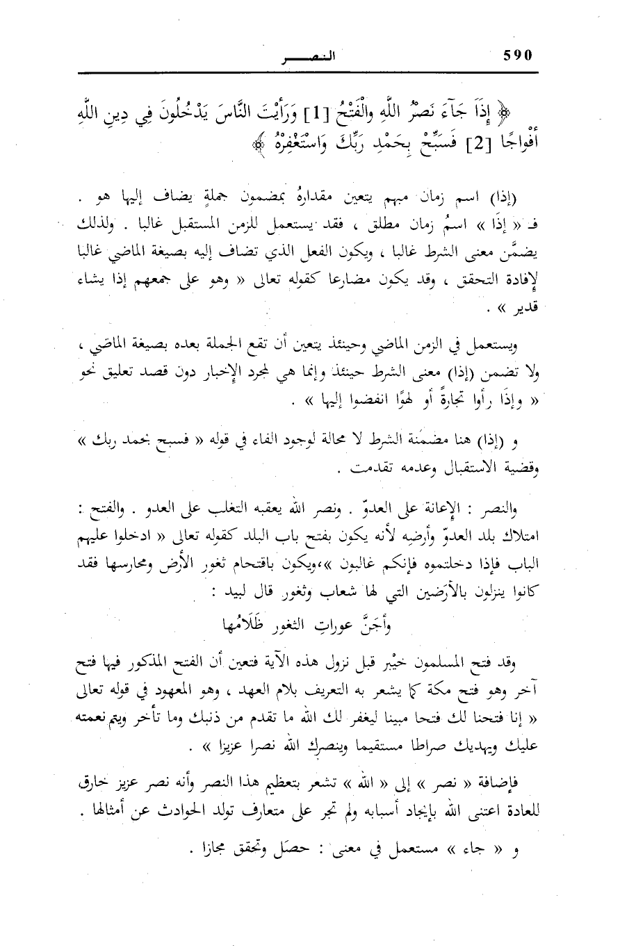 وإِذا هُنَا مُضَمَّنَةٌ الشَّرْطَ لَا مَحَالَةَ لوُجُود الْفَاء فِي قَوْله: فَسَبِّحْ بِحَمْدِ رَبِّكَ وَقَضِيَّةُ الِاسْتِقْبَالِ وَعَدَمِهِ تَقَدَّمَتْ.