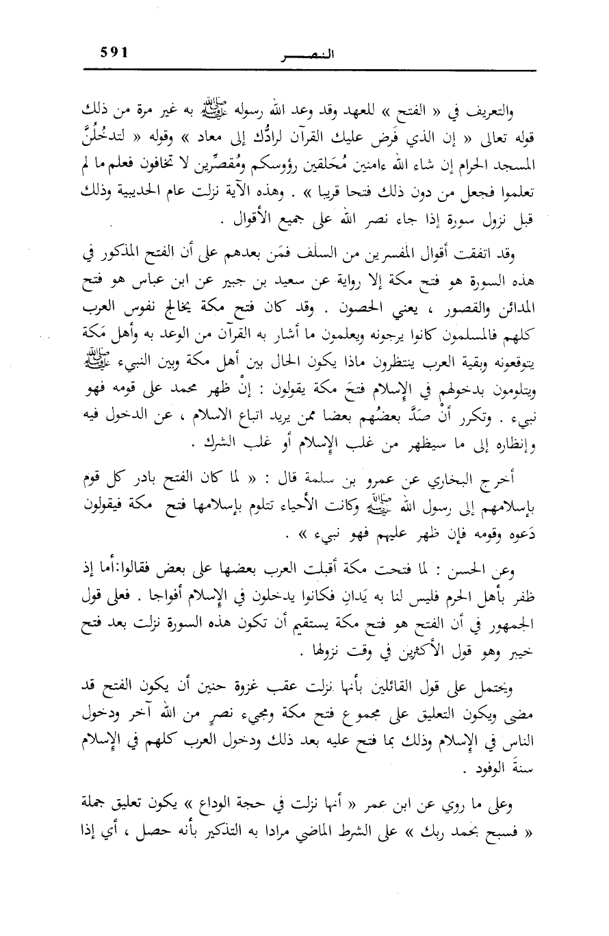 وَقَدِ اتَّفَقَتْ أَقْوَالُ الْمُفَسِّرِينَ مِنَ السَّلَفِ فَمَنْ بَعْدَهُمْ عَلَى أَنَّ الْفَتْحَ الْمَذْكُورَ فِي هَذِهِ السُّورَةِ هُوَ فَتْحُ مَكَّةَ إِلَّا رِوَايَةً عَنْ سَعِيدِ بْنِ جُبَيْرٍ عَنِ ابْنِ عَبَّاسٍ هُوَ فَتْحُ الْمَدَائِن والقصور، يعنون الْحُصُونَ. وَقَدْ كَانَ فَتْحُ مَكَّةَ يُخَالِجُ نُفُوسَ الْعَرَبِ كُلِّهِمْ فَالْمُسْلِمُونَ كَانُوا يَرْجُونَهُ وَيَعْلَمُونَ مَا أَشَارَ بِهِ الْقُرْآنُ من الْوَعْد بِهِ وَأَهْلُ مَكَّةَ يَتَوَقَّعُونَهُ وَبَقِيَّةُ الْعَرَبِ يَنْتَظِرُونَ مَاذَا يَكُونُ الْحَالُ بَيْنَ أَهْلِ مَكَّةَ وَبَيْنَ النَّبِيءِ صَلَّى اللهُ عَلَيْهِ وَسَلَّمَ وَيَتَلَوَّمُونَ بِدُخُولِهِمْ فِي الْإِسْلَامِ فَتْحَ مَكَّةَ يَقُولُونَ: إِنْ ظَهَرَ مُحَمَّدٌ عَلَى قومه فَهُوَ نبيء. وَتَكَرَّرَ أَنْ صَدَّ بَعْضُهُمْ بَعْضًا مِمَّنْ يُرِيدُ اتِّبَاعَ الْإِسْلَامِ عَنِ الدُّخُولِ فِيهِ وَإِنْظَارُهُ إِلَى مَا سَيَظْهَرُ مِنْ غَلَبِ الْإِسْلَامِ أَوْ غَلَبِ الشِّرْكِ.