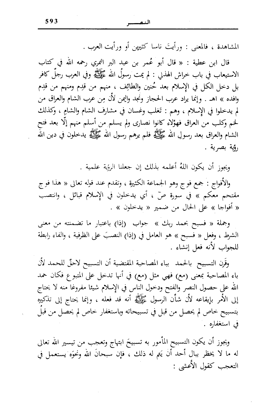 وَالْأَفْوَاجُ: جَمْعُ فَوْجٍ وَهُوَ الْجَمَاعَةُ الْكَثِيرَةُ، وَتَقَدَّمَ عِنْدَ قَوْلِهِ تَعَالَى: هَذَا فَوْجٌ مُقْتَحِمٌ مَعَكُمْ فِي سُورَةِ ص [59] ، أَيْ يَدْخُلُونَ فِي الْإِسْلَام قبائل، وَانْتَصَبَ أَفْواجاً عَلَى الْحَالِ مِنْ ضَمِيرِ يَدْخُلُونَ وَجُمْلَةُ: فَسَبِّحْ بِحَمْدِ رَبِّكَ جَوَابُ إِذا بِاعْتِبَارِ مَا تَضَمَّنَتْهُ مِنْ مَعْنَى الشَّرْطِ، وَفِعْلُ فَسَبِّحْ هُوَ الْعَامِلُ فِي إِذا النَّصْبَ عَلَى الظَّرْفِيَّةِ، وَالْفَاءُ رَابِطَةٌ لِلْجَوَابِ لِأَنَّهُ فِعْلُ إِنْشَاءٍ.