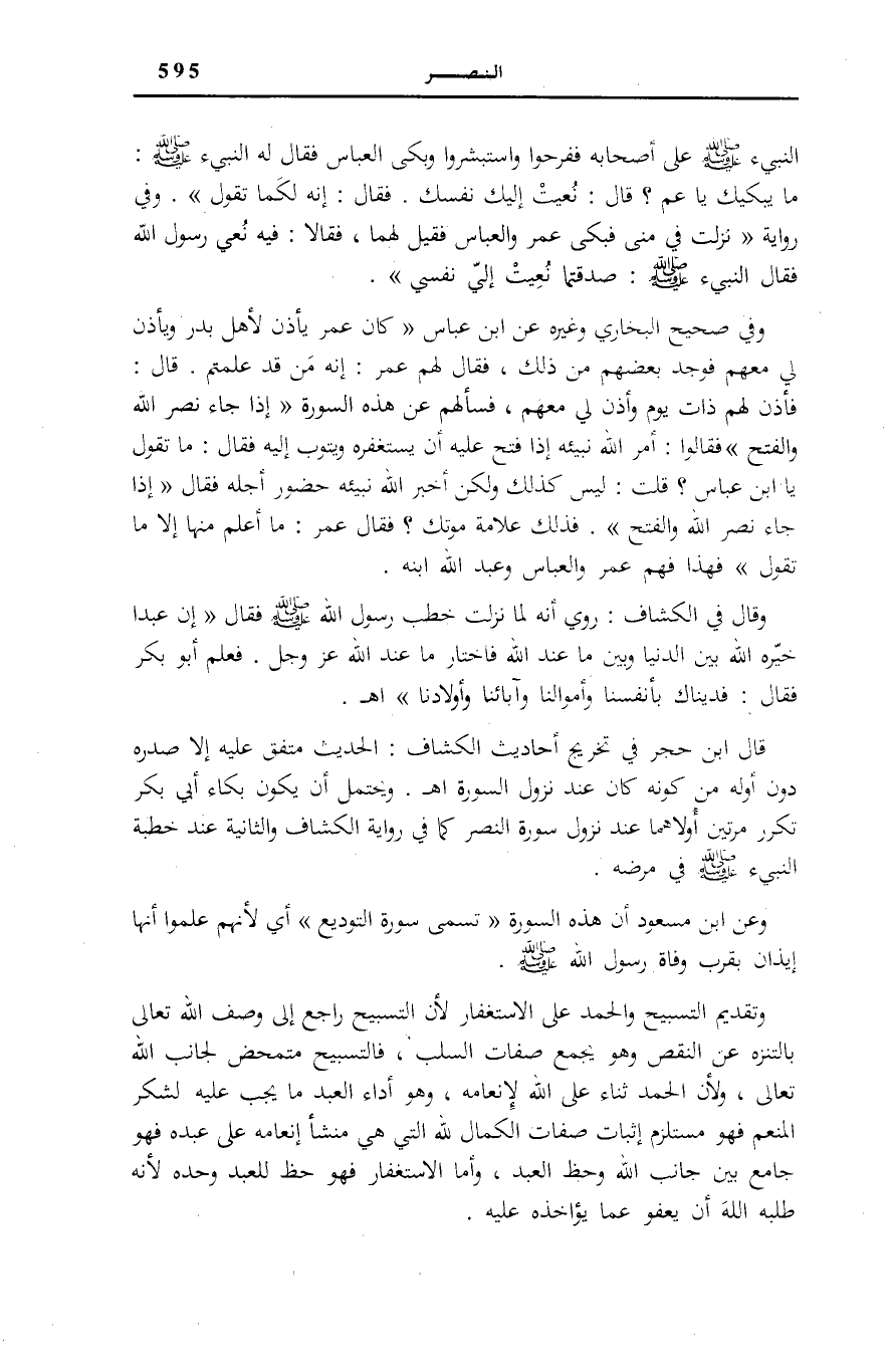. وَفِي «صَحِيحِ الْبُخَارِيِّ» وَغَيْرِهِ عَنْ ابْنِ عَبَّاسٍ: «كَانَ عُمَرُ يَأْذَنُ لِأَهْلِ بَدْرٍ وَيَأْذَنُ لِي مَعَهُمْ فَوَجَدَ بَعْضُهُمْ مِنْ ذَلِكَ، فَقَالَ لَهُمْ عُمَرُ: إِنَّهُ مَنْ قَدْ عَلِمْتُمْ. قَالَ: فَأَذِنَ لَهُمْ ذَاتَ يَوْمٍ وَأَذِنَ لِي مَعَهُمْ، فَسَأَلَهُمْ عَنْ هَذِهِ السُّورَةِ: إِذا جاءَ نَصْرُ اللَّهِ وَالْفَتْحُ فَقَالُوا: أَمَرَ اللَّهُ نَبِيئَهُ إِذَا فَتَحَ عَلَيْهِ أَنْ يَسْتَغْفِرَهُ وَيَتُوبَ إِلَيْهِ فَقَالَ: مَا تَقُوُلُ يَا ابْنَ عَبَّاسٍ؟ قُلْتُ: لَيْسَ كَذَلِكَ وَلَكِنْ أَخْبَرَ اللَّهُ نَبِيئَهُ حُضُورَ أَجَلِهِ فَقَالَ: إِذا جاءَ نَصْرُ اللَّهِ وَالْفَتْحُ، فَذَلِكَ عَلَامَةُ مَوْتِكَ؟ فَقَالَ عُمَرُ: مَا أَعْلَمُ مِنْهَا إِلَّا مَا تَقُولُ» فَهَذَا فَهْمُ عُمَرَ وَالْعَبَّاسِ وَعَبْدِ اللَّهِ ابْنِهِ.