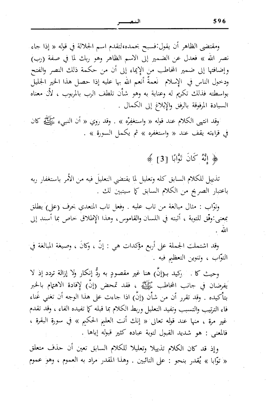 وَحَيْثُ كَانَ توكيد بِ (إِنَّ) هُنَا غَيْرَ مَقْصُودٍ بِهِ رَدُّ إِنْكَارٍ وَلَا إِزَالَةُ تَرَدُّدٍ إِذْ لَا يُفْرَضَانِ فِي جَانِبِ الْمُخَاطَبِ صَلَّى اللهُ عَلَيْهِ وَسَلَّمَ، فَقَدْ تَمَحَّضَ (إِنَّ) لِإِفَادَةِ الِاهْتِمَامِ بِالْخَبَرِ بِتَأْكِيدِهِ. وَقَدْ تَقَرَّرَ أَنَّ مِنْ شَأْنِ (إِنَّ) إِذَا جَاءَتْ عَلَى هَذَا الْوَجْهِ أَنَّ تُغْنِيَ غَنَاءَ فَاءِ التَّرْتِيبِ وَالتَّسَبُّبِ وَتُفِيدُ التَّعْلِيلَ وَرَبْطَ الْكَلَامِ بِمَا قَبْلَهُ كَمَا تُفِيدُهُ الْفَاءُ، وَقَدْ تَقَدَّمَ غَيْرَ مَرَّةٍ، مِنْهَا عِنْدَ قَوْلِهِ تَعَالَى: إِنَّكَ أَنْتَ الْعَلِيمُ الْحَكِيمُ فِي سُورَةِ الْبَقَرَةِ [32] ، فَالْمَعْنَى: هُوَ شَدِيدُ الْقَبُولِ لِتَوْبَةِ عِبَادِهِ كَثِيرٌ قَبُولُهُ إِيَّاهَا.