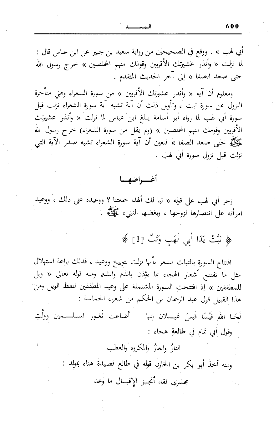 وَمَعْلُومٌ أَنَّ آيَةَ: وَأَنْذِرْ عَشِيرَتَكَ الْأَقْرَبِينَ مِنْ سُورَةِ الشُّعَرَاءِ [214] ، وَهِيَ مُتَأَخِّرَةُ النُّزُولِ عَنْ سُورَةِ تَبَّتْ، وَتَأْوِيلُ ذَلِكَ أَنَّ آيَةً تُشْبِهُ آيَةَ سُورَةِ الشُّعَرَاءِ نَزَلَتْ قَبْلَ سُورَةِ أَبِي لَهَبٍ لِمَا
