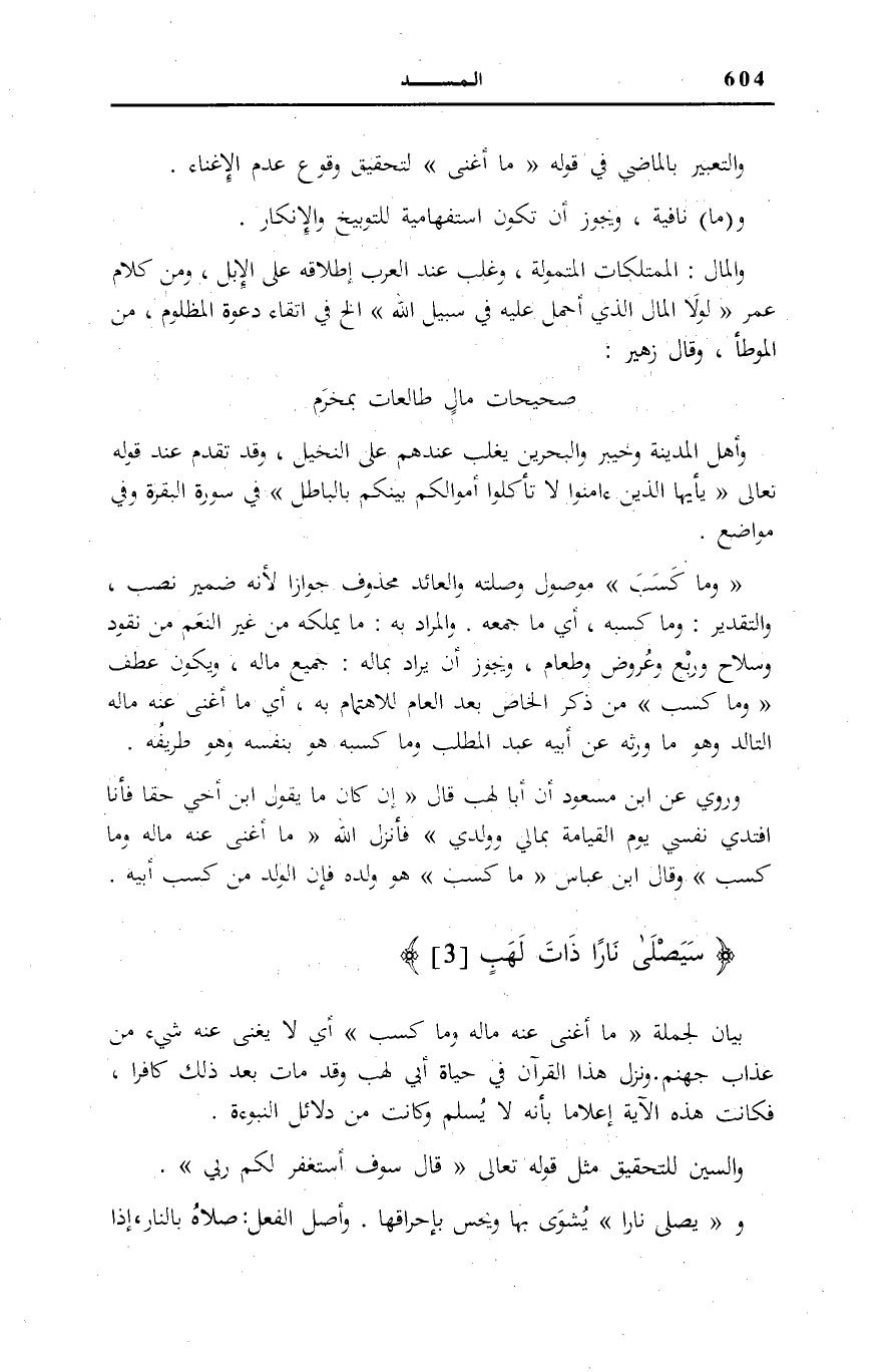 وَمَا كَسَبَهُ، أَيْ مَا جَمَعَهُ. وَالْمُرَادُ بِهِ: مَا يَمْلِكُهُ مِنْ غَيْرِ النَّعَمِ مِنْ نُقُودٍ وَسِلَاحٍ وَرَبْعٍ وَعُرُوضٍ وَطَعَامٍ، وَيَجُوزُ أَنْ يُرَادَ بِمَالِهِ: جَمِيعُ مَالِهِ، وَيَكُونَ عَطْفُ وَما كَسَبَ مِنْ ذِكْرِ الْخَاصِّ بَعْدَ الْعَامِّ لِلِاهْتِمَامِ بِهِ، أَيْ مَا أَغْنَى عَنْهُ مَالُهُ التَّالِدُ وَهُوَ مَا وَرِثَهُ عَنْ أَبِيهِ عَبْدِ الْمُطَّلِبِ وَمَا كَسَبَهُ هُوَ بِنَفْسِهِ وَهُوَ طَرِيفُهُ.