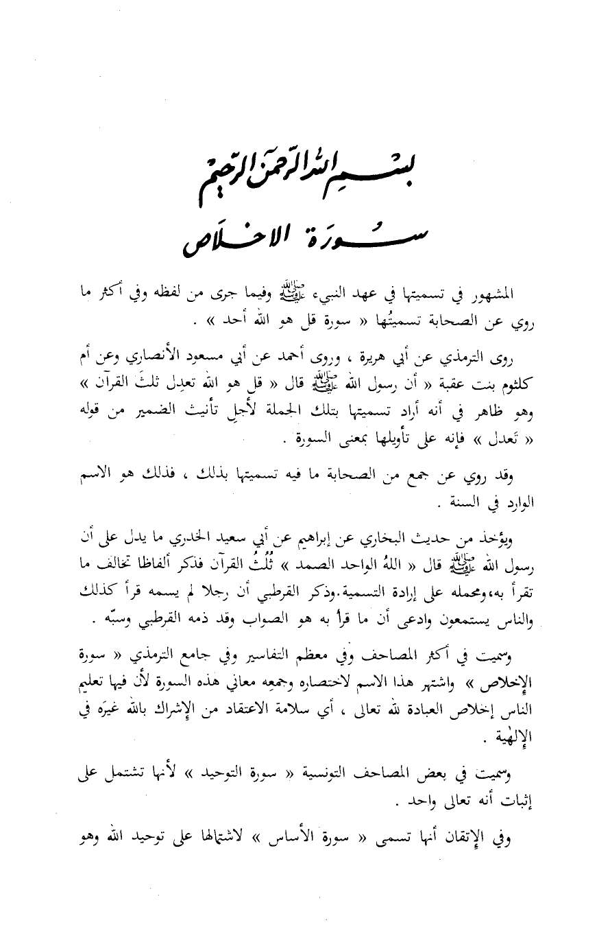 الْمَشْهُورُ فِي تَسْمِيَتِهَا فِي عَهْدِ النَّبِيءِ صَلَّى اللهُ عَلَيْهِ وَسَلَّمَ وَفِيمَا جَرَى مِنْ لَفْظِهِ وَفِي أَكْثَرِ مَا رُوِيَ عَنِ الصَّحَابَةِ تَسْمِيَتُهَا «سُورَةَ قُلْ هُوَ اللَّهُ أَحَدٌ» .