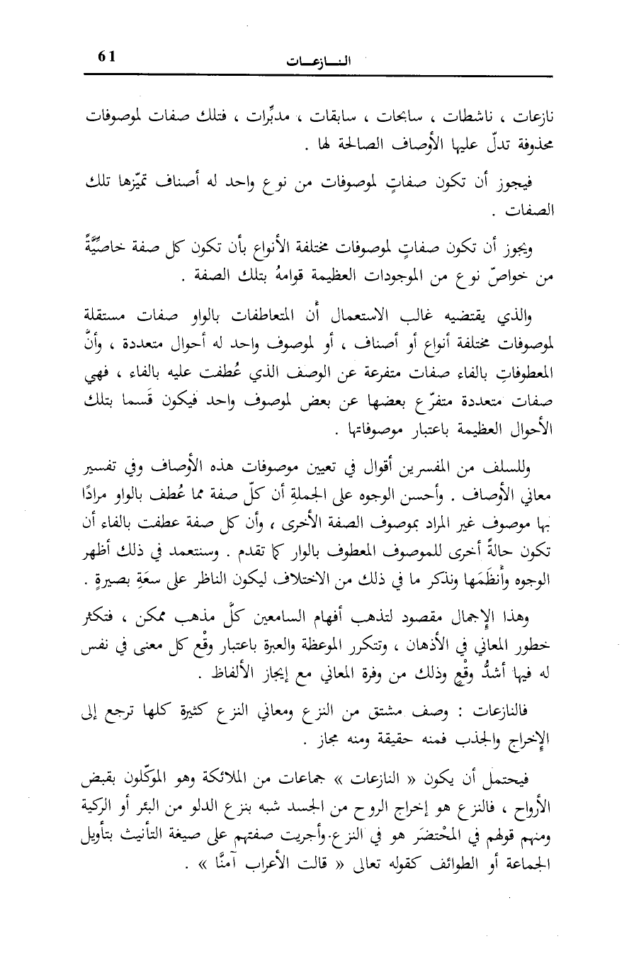 نَازِعَاتٌ، نَاشِطَاتٌ، سَابِحَاتٌ، سَابِقَاتٌ، مُدَبِّرَاتٌ، فَتِلْكَ صِفَاتٌ لِمَوْصُوفَاتٍ مَحْذُوفَةٍ تَدُلُّ عَلَيْهَا الْأَوْصَافُ الصَّالِحَةُ لَهَا.