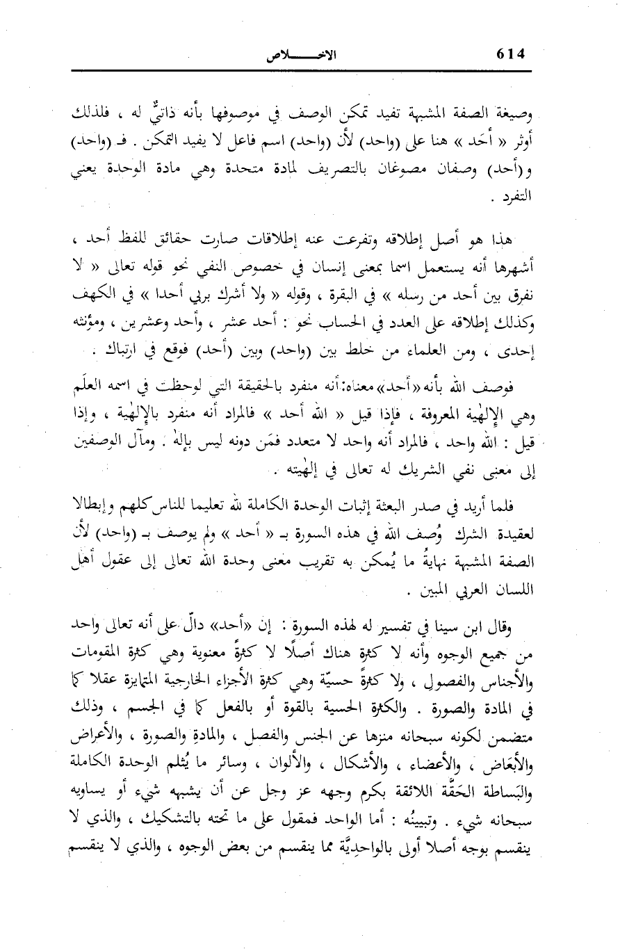 وَقَالَ ابْنُ سِينَا فِي تَفْسِيرٍ لَهُ لِهَذِهِ السُّورَةِ: إِن أَحَدٌ دَالٌّ عَلَى أَنَّهُ تَعَالَى وَاحِدٌ مِنْ جَمِيعِ الْوُجُوهِ وَأَنَّهُ لَا كَثْرَةَ هُنَاكَ أَصْلًا لَا كَثْرَةً مَعْنَوِيَّةً وَهِيَ كَثْرَةُ الْمُقَوِّمَاتِ وَالْأَجْنَاسِ وَالْفُصُولِ، وَلَا كَثْرَةً حِسِّيَّةً وَهِيَ كَثْرَةُ الْأَجْزَاءِ الْخَارِجِيَّةِ الْمُتَمَايِزَةِ عَقْلًا كَمَا فِي الْمَادَّةِ وَالصُّورَةِ. وَالْكَثْرَةُ الْحِسِّيَّةُ بِالْقُوَّةِ أَوْ بِالْفِعْلِ كَمَا فِي الْجِسْمِ، وَذَلِكَ مُتَضَمِّنٌ لِكَوْنِهِ سُبْحَانَهُ مُنَزَّهًا عَنِ الْجِنْسِ وَالْفَصْلِ، وَالْمَادَّةِ وَالصُّورَةِ، وَالْأَعْرَاضِ وَالْأَبْعَاضِ، وَالْأَعْضَاءِ، وَالْأَشْكَالِ، وَالْأَلْوَانِ، وَسَائِرِ مَا يَثْلَمُ الْوَحْدَةَ الْكَامِلَةَ وَالْبَسَاطَةَ الْحَقَّةَ اللَّائِقَةَ بِكَرَمِ وَجْهِهِ عز وَجل عَن أَنْ يُشْبِهَهُ شَيْءٌ أَوْ يُسَاوِيَهُ سُبْحَانَهُ شَيْءٌ. وَتَبْيِينُهُ: أَمَّا الْوَاحِدُ فَمَقُولٌ عَلَى مَا تَحْتَهُ بِالتَّشْكِيكِ، وَالَّذِي لَا يَنْقَسِم بِوَجْه أصلا أولى بالوحدانيّة مِمَّا يَنْقَسِمُ مِنْ بَعْضِ الْوُجُوهِ، وَالَّذِي لَا يَنْقَسِمُ