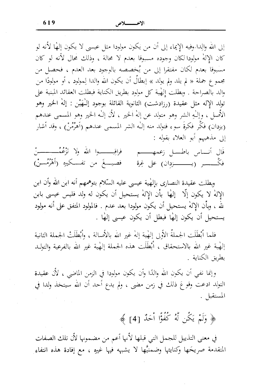 إِبْطَالُ أَنْ يَكُونَ اللَّهُ وَالِدًا لِمَوْلُودٍ، أَوْ مَوْلُودًا مِنْ وَالِدٍ بِالصَّرَاحَةِ. وَبَطَلَتْ إِلَهِيَّةُ كُلِّ مَوْلُودٍ بِطَرِيقِ الْكِنَايَةِ فَبَطَلَتِ الْعَقَائِدُ الْمَبْنِيَّةُ عَلَى تَوَلُّدِ الْإِلَهِ مِثْلَ عَقِيدَةِ (زَرَادِشْتَ) الثَّانَوِيَّةِ الْقَائِلَةِ بِوُجُودِ إِلَهَيْنِ: إِلَهِ الْخَيْرِ وَهُوَ الْأَصْلُ، وَإِلَهِ الشَّرِّ وَهُوَ مُتَوَلَّدٌ عَنْ إِلَهِ الْخَيْرِ، لِأَنَّ إِلَهَ الْخَيْرِ وَهُوَ الْمُسَمَّى عِنْدَهُمْ (يَزْدَانَ) فَكَّرَ فِكْرَةَ سُوءٍ فَتَوَلَّدَ مِنْهُ إِلَهُ الشَّرِّ الْمُسَمَّى عِنْدَهُمْ (أَهْرُمُنْ) ، وَقَدْ أَشَارَ إِلَى مَذْهَبِهِمْ أَبُو الْعَلَاءِ بِقَوْلِهِ: