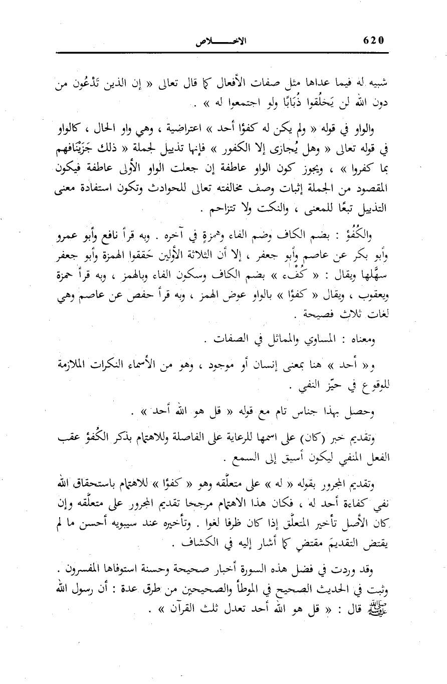 وَحَصَلَ بِهَذَا جِنَاسٌ تَامٌّ مَعَ قَوْلِهِ: قُلْ هُوَ اللَّهُ أَحَدٌ وَتَقْدِيمُ خَبَرِ (كَانَ) عَلَى اسْمِهَا لِلرِّعَايَةِ عَلَى الْفَاصِلَةِ وَلِلِاهْتِمَامِ بِذِكْرِ الْكُفُؤِ عَقِبَ الْفِعْلِ الْمَنْفِيِّ لِيَكُونَ أَسْبَقَ إِلَى السَّمْعِ.