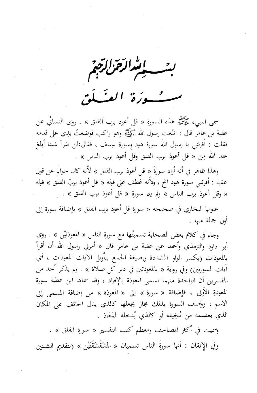وَهَذَا ظَاهِرٌ فِي أَنَّهُ أَرَادَ سُورَةَ: قُلْ أَعُوذُ بِرَبِّ الْفَلَقِ لِأَنَّهُ كَانَ جَوَابا عَن قَوْلِ عُقْبَةَ: أَقْرِئْنِي سُورَةَ هُودٍ إِلَخْ، وَلِأَنَّهُ عَطَفَ عَلَى قَوْلِهِ: قُلْ أَعُوذُ بِرَبِّ الْفَلَقِ [الْفَلَقِ: 1] قَوْلَهُ: وقُلْ أَعُوذُ بِرَبِّ النَّاسِ [النَّاسِ: 1] وَلَمْ يُتِمَّ سُورَةَ: قُلْ أَعُوذُ بِرَبِّ الْفَلَقِ عَنْوَنَهَا الْبُخَارِيُّ فِي «صَحِيحِهِ» : سُورَةَ قُلْ أَعُوذُ بِرَبِّ الْفَلَقِ» بِإِضَافَةِ سُورَةِ إِلَى أَوَّلِ جُمْلَةٍ مِنْهَا.