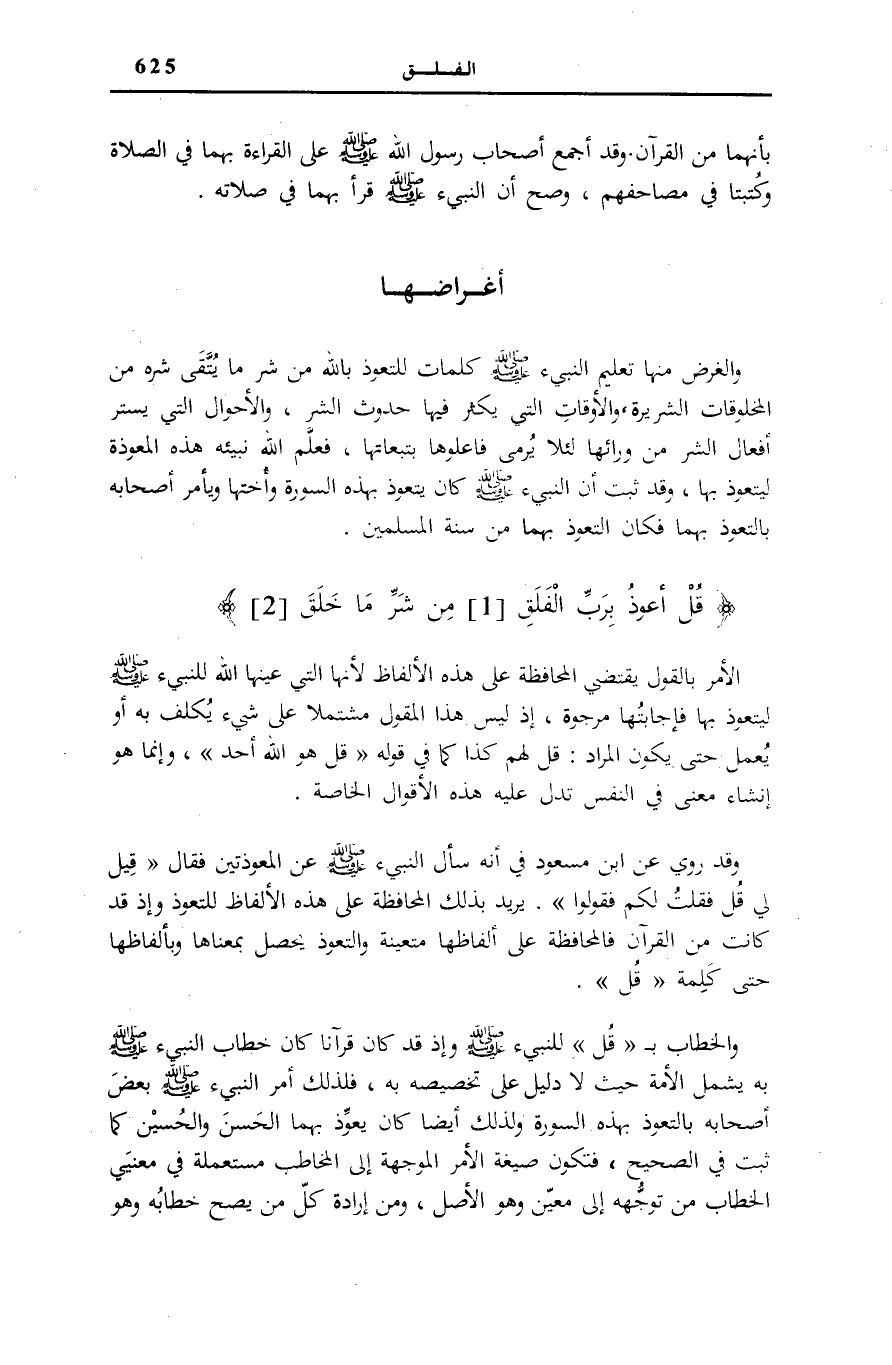 . يُرِيدُ بِذَلِكَ الْمُحَافَظَةَ عَلَى هَذِهِ الْأَلْفَاظِ لِلتَّعَوُّذِ وَإِذْ قَدْ كَانَتْ مِنَ الْقُرْآنِ فَالْمُحَافَظَةُ عَلَى أَلْفَاظِهَا مُتَعَيِّنَةٌ وَالتَّعَوُّذُ يَحْصُلُ بِمَعْنَاهَا وَبِأَلْفَاظِهَا حَتَّى كَلِمَةِ قُلْ وَالْخطاب ب قُلْ لِلنَّبِيءِ صَلَّى اللهُ عَلَيْهِ وَسَلَّمَ وَإِذَ قَدْ كَانَ قُرْآنًا كَانَ خِطَابُ النَّبِيءِ صَلَّى اللهُ عَلَيْهِ وَسَلَّمَ بِهِ يَشْمَلُ الْأُمَّةَ حَيْثُ لَا دَلِيلَ عَلَى تَخْصِيصِهِ بِهِ، فَلِذَلِكَ أَمَرَ النَّبِيءُ صَلَّى اللهُ عَلَيْهِ وَسَلَّمَ بَعْضَ أَصْحَابِهِ بِالتَّعَوُّذِ بِهَذِهِ السُّورَةِ وَلِذَلِكَ أَيْضًا كَانَ يُعَوِّذُ بِهِمَا الْحَسَنَ وَالْحُسَيْنَ كَمَا ثَبَتَ فِي «الصَّحِيحِ» ، فَتَكُونُ صِيغَةُ الْأَمْرِ الْمُوَجَّهَةُ إِلَى الْمُخَاطَبِ مُسْتَعْمَلَةً فِي مَعْنَيَيِ الْخِطَابِ مِنْ تَوَجُّهِهِ إِلَى مُعَيَّنٍ وَهُوَ الْأَصْلُ، وَمِنْ إِرَادَةِ كُلِّ مَنْ يَصِحُّ خِطَابُهُ وَهُوَ