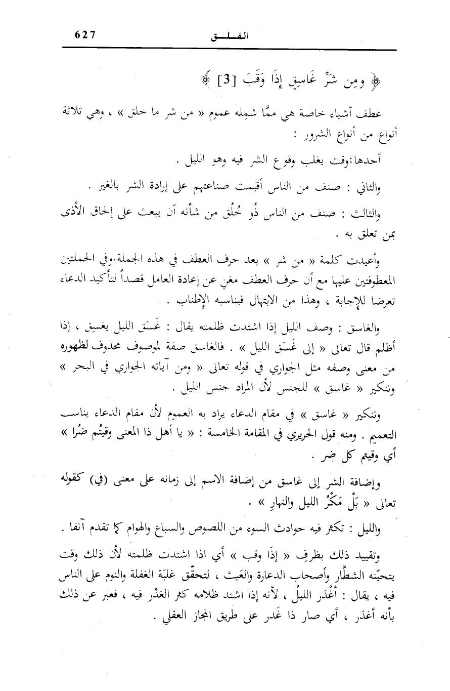 وَالْغَاسِقُ: وَصْفُ اللَّيْلِ إِذَا اشْتَدَّتْ ظُلْمَتُهُ يُقَالُ: غَسَقَ اللَّيْلُ يَغْسِقُ، إِذَا أَظْلَمَ قَالَ تَعَالَى: إِلى غَسَقِ اللَّيْلِ [الْإِسْرَاء: 78] ، فَالْغَاسِقُ صِفَةٌ لِمَوْصُوفٍ مَحْذُوفٍ لِظُهُورِهِ مِنْ مَعْنَى وَصْفِهِ مِثْلَ الْجَوَارِي فِي قَوْلِهِ تَعَالَى: وَمِنْ آياتِهِ الْجَوارِ فِي الْبَحْرِ [الشورى: 32] وَتَنْكِيرُ غاسِقٍ لِلجِّنْسِ لِأَنَّ الْمُرَادَ جِنْسُ اللَّيْلِ.