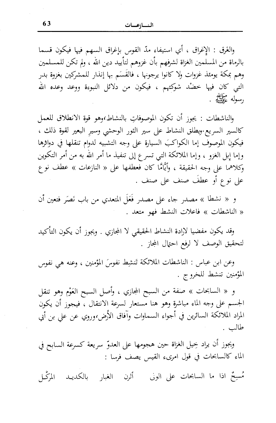 والنَّاشِطاتِ: يَجُوزُ أَنْ تَكُونَ الْمَوْصُوفَاتِ بِالنَّشَاطِ، وَهُوَ قُوَّةُ الِانْطِلَاقِ لِلْعَمَلِ كالسير السَّرِيع، وينطلق النَّشَاطُ عَلَى سَيْرِ الثَّوْرِ الْوَحْشِيِّ وَسَيْرِ الْبَعِيرِ لِقُوَّةِ ذَلِكَ، فَيَكُونُ الْمَوْصُوفُ إِمَّا الْكَوَاكِبَ السَّيَّارَةَ عَلَى وَجْهِ التَّشْبِيهِ لِدَوَامِ تَنَقُّلِهَا فِي دَوَائِرِهَا وَإِمَّا إِبِلَ الْغَزْوِ، وَإِمَّا الْمَلَائِكَةَ الَّتِي تُسْرِعُ إِلَى تَنْفِيذِ مَا أَمَرَ اللَّهُ بِهِ مِنْ أَمْرِ التَّكْوِينِ وَكِلَاهُمَا عَلَى وَجْهِ الْحَقِيقَةِ، وَأَيًّا مَا كَانَ فَعَطْفُهَا عَلَى النَّازِعاتِ عَطْفُ نَوْعٍ عَلَى نَوْعٍ أَوْ عَطْفُ صِنْفٍ عَلَى صِنْفٍ.
