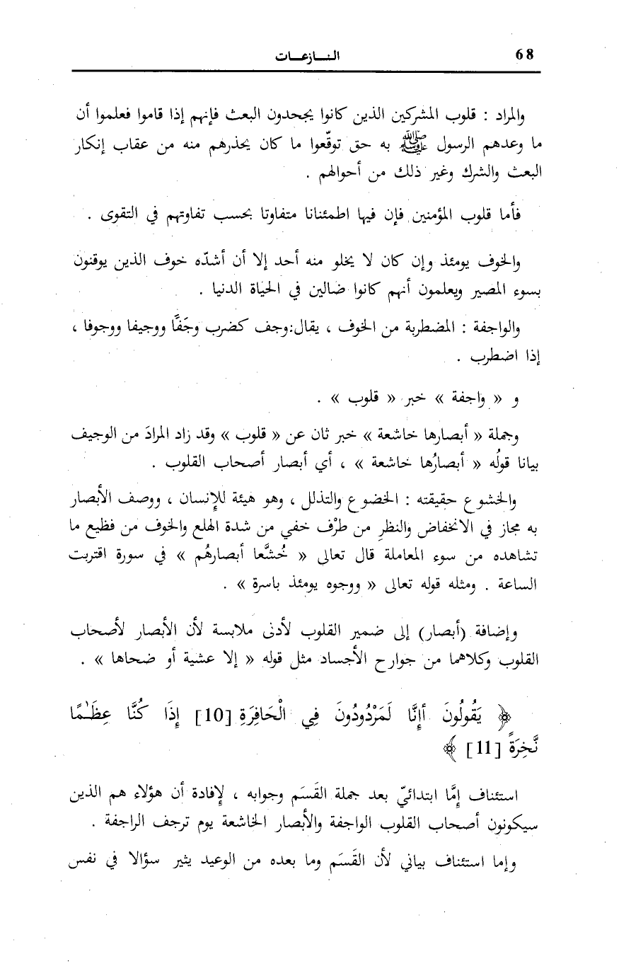 اسْتِئْنَافٌ إِمَّا ابْتِدَائِيٌّ بَعْدَ جُمْلَةِ الْقَسَمِ وَجَوَابِهِ، لِإِفَادَةِ أَنَّ هَؤُلَاءِ هُمُ الَّذِينَ سَيَكُونُونَ أَصْحَابَ الْقُلُوبِ الْوَاجِفَةِ وَالْأَبْصَارِ الْخَاشِعَةِ يَوْمَ تَرْجُفُ الرَّاجِفَةُ.