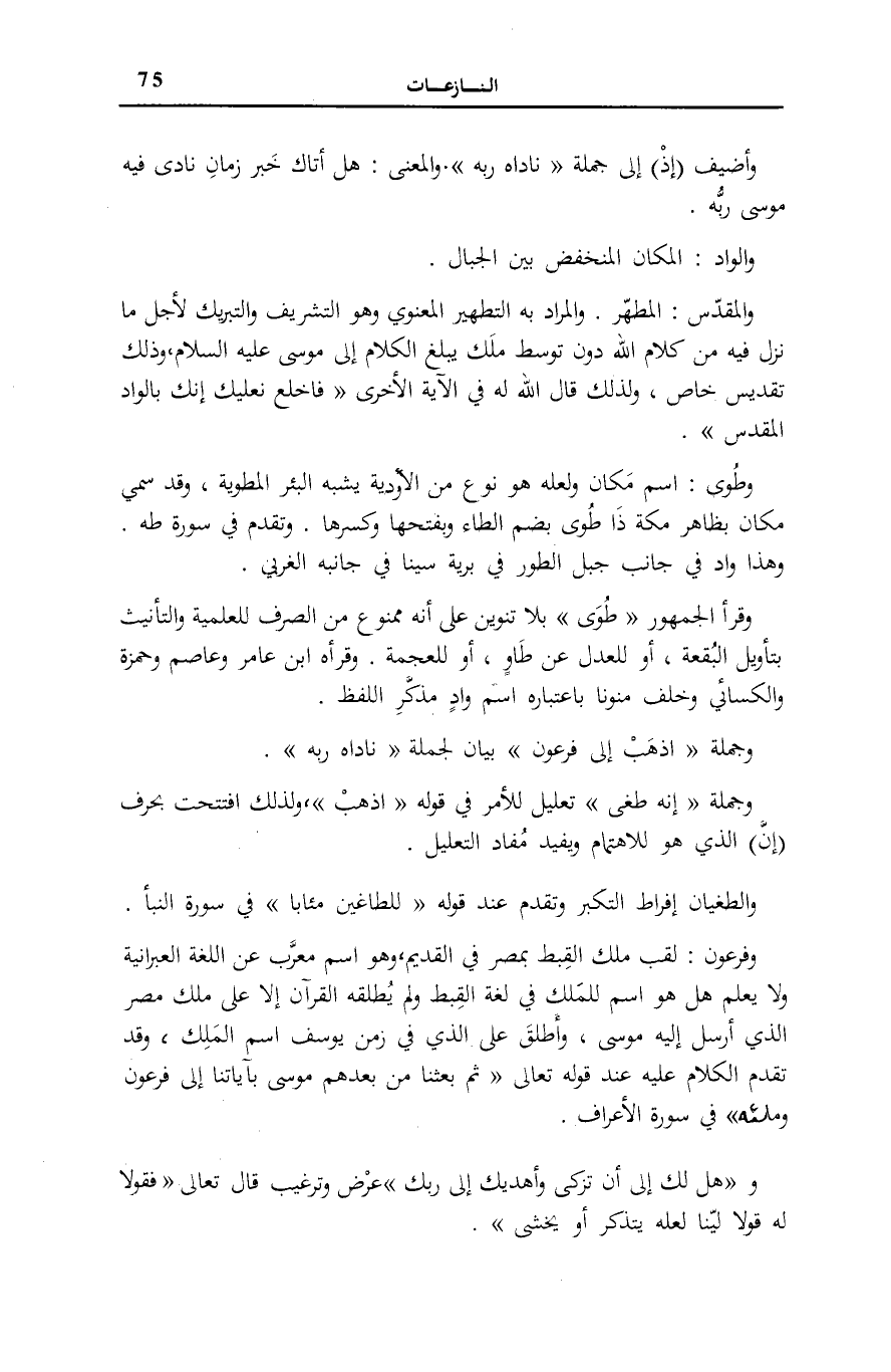 وَقَرَأَ الْجُمْهُورُ طُوىً بِلَا تَنْوِينٍ عَلَى أَنَّهُ مَمْنُوعٌ مِنَ الصَّرْفِ لِلْعَلَمِيَّةِ وَالتَّأْنِيثِ بِتَأْوِيلِ الْبُقْعَةِ، أَوْ لِلْعَدْلِ عَنْ طَاوٍ، أَوْ لِلْعُجْمَةِ. وَقَرَأَهُ ابْنُ عَامِرٍ وَعَاصِمٌ وَحَمْزَةُ وَالْكِسَائِيُّ وَخَلَفٌ مُنَوَّنًا بِاعْتِبَارِهِ اسْمَ وَادٍ مُذَكَّرَ اللَّفْظِ.