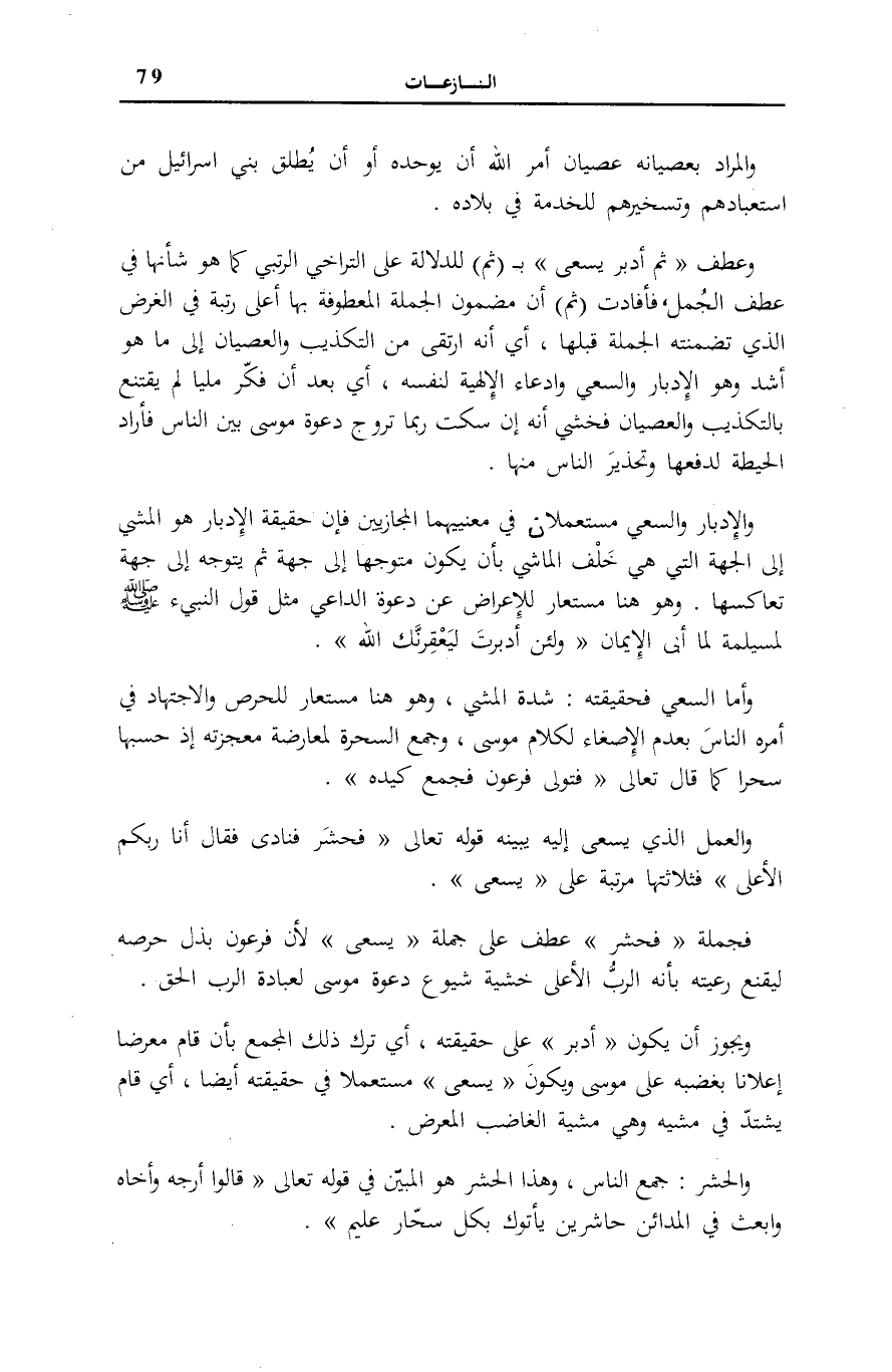 وَالْعَمَلُ الَّذِي يَسْعَى إِلَيْهِ يُبَيِّنُهُ قَوْلُهُ تَعَالَى: فَحَشَرَ فَنادى فَقالَ أَنَا رَبُّكُمُ الْأَعْلى فَثَلَاثَتُهَا مُرَتَّبَةٌ عَلَى يَسْعى فَجُمْلَةُ فَحَشَرَ عَطْفٌ عَلَى جُمْلَةِ يَسْعى لِأَنَّ فِرْعَوْنَ بَذَلَ حِرْصَهُ لِيُقْنِعَ رَعِيَّتَهُ بِأَنَّهُ الرَّبُّ الْأَعْلَى خَشْيَةَ شُيُوعِ دَعْوَةِ مُوسَى لِعِبَادَةِ الرَّبِّ الْحَقِّ.