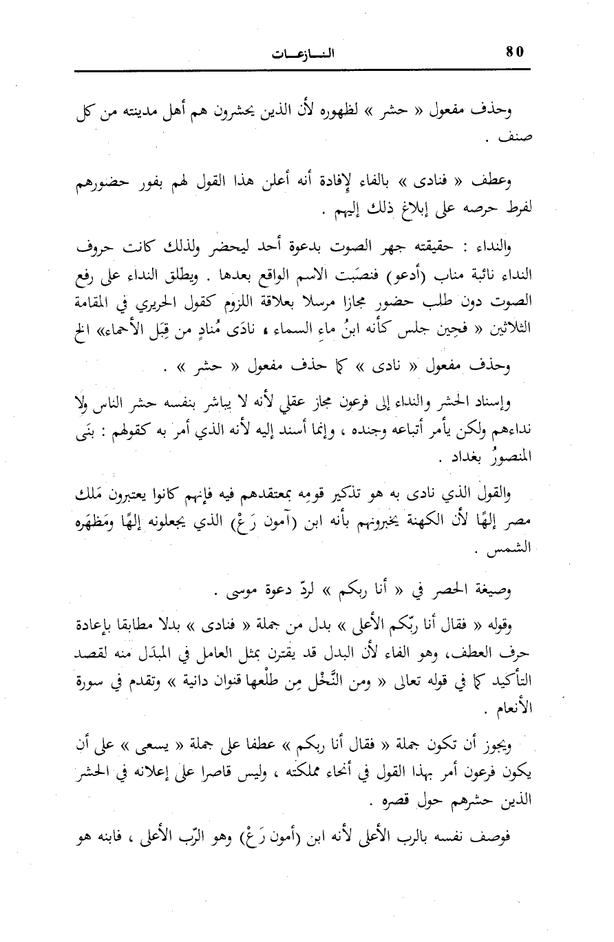 وَيَجُوزُ أَنْ تَكُونَ جُمْلَةُ: فَقالَ أَنَا رَبُّكُمُ عَطْفًا عَلَى جُمْلَةِ يَسْعى عَلَى أَنْ يَكُونَ فِرْعَوْنُ أَمَرَ بِهَذَا الْقَوْلِ فِي أَنْحَاءِ مَمْلَكَتِهِ، وَلَيْسَ قَاصِرًا عَلَى إِعْلَانِهِ فِي الْحَشْرِ الَّذِينَ حَشَرَهُمْ حَوْلَ قَصْرِهِ.