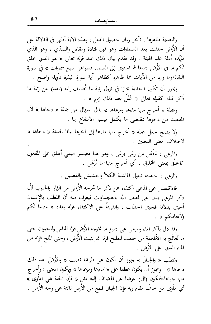 وَنَصْبُ وَالْجِبالَ يَجُوزُ أَنْ يَكُونَ عَلَى طَرِيقَةِ نَصْبِ وَالْأَرْضَ بَعْدَ ذلِكَ دَحاها وَيَجُوزُ أَنْ يَكُونَ عَطْفًا عَلَى ماءَها وَمَرْعاها وَيَكُونُ الْمَعْنَى: وَأَخْرَجَ مِنْهَا جِبَالَهَا، فَتَكُونُ (الْ) عِوَضًا عَنِ الْمُضَافِ إِلَيْهِ مِثْلَ فَإِنَّ الْجَنَّةَ هِيَ الْمَأْوى [النازعات: 41] أَيْ مَأْوَى مَنْ خَافَ مَقَامَ رَبِّهِ فَإِنَّ الْجِبَالَ قِطَعٌ مِنَ الْأَرْضِ نَاتِئَةٌ عَلَى وَجْهِ الْأَرْضِ.