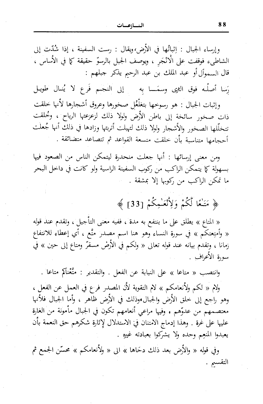 وَمِنْ مَعْنَى إِرْسَائِهَا: أَنَّهَا جُعِلَتْ مُنْحَدِرَةً لِيَتَمَكَّنَ النَّاسُ مِنَ الصُّعُودِ فِيهَا بِسُهُولَةٍ كَمَا يَتَمَكَّنُ الرَّاكِبُ مِنْ رُكُوبِ السَّفِينَةِ الرَّاسِيَةِ وَلَوْ كَانَتْ فِي دَاخِلِ الْبَحْرِ مَا تمكن الرَّاكِب مِنْ رُكُوبِهَا إِلَّا بِمَشَقَّة.