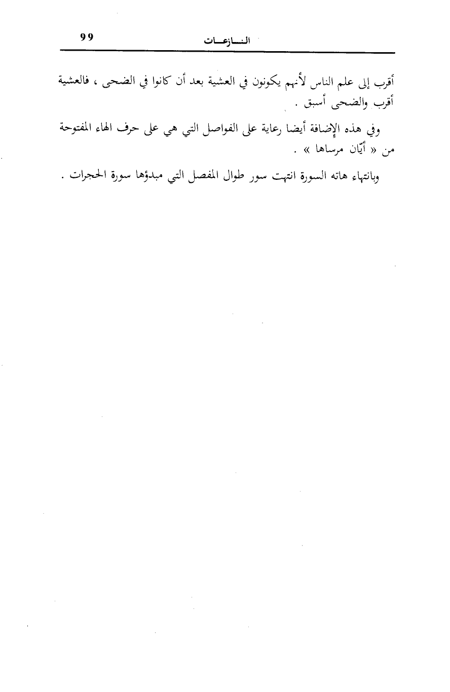 وَفِي هَذِهِ الْإِضَافَةِ أَيْضًا رِعَايَةٌ عَلَى الْفَوَاصِلِ الَّتِي هِيَ عَلَى حَرْفِ الْهَاءِ الْمَفْتُوحَةِ مِنْ أَيَّانَ مُرْساها وَبِانْتِهَاءِ هَاتِهِ السُّورَةِ انْتَهَتْ سُوَرُ طِوَالِ الْمُفَصَّلِ الَّتِي مَبْدَؤُهَا سُورَةُ الْحُجُرَاتِ.
