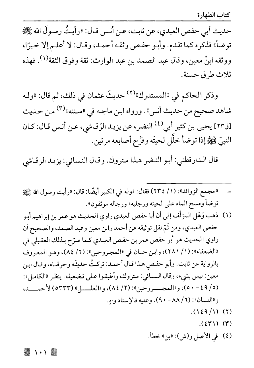حديث أبي حفص العبدي، عن ثابت، عن أنس قال: "رأيتُ رسولَ الله - صلى الله عليه وسلم - توضأ" فذكره كما تقدم. وأبو حفص وثقه أحمد، وقال: لا أعلم إلا خيرًا, ووثقه ابنُ معين، وقال عبد الصمد بن عبد الوارث: ثقة وفوق الثقة (¬١). فهذه ثلاث طرق حسنة.