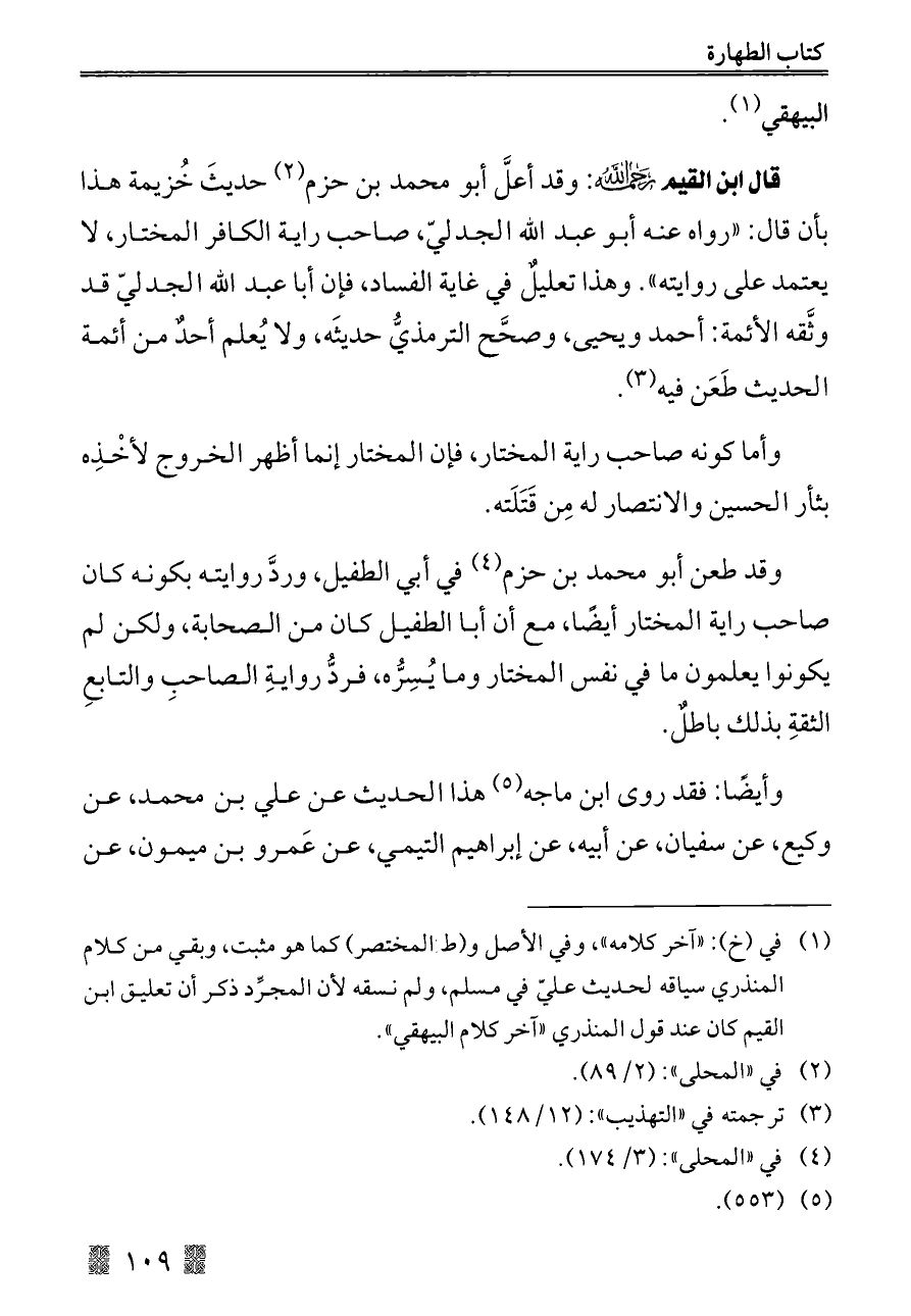 قال ابن القيم - رحمه الله -: وقد أعلَّ أبو محمد بن حزم (¬٢) حديثَ خُزيمة هذا بأن قال: "رواه عنه أبو عبد الله الجدليّ, صاحب راية الكافر المختار, لا يعتمد على روايته". وهذا تعليلٌ في غاية الفساد, فإن أبا عبد الله الجدليّ قد وثَّقه الأئمة: أحمد ويحيى، وصحَّح الترمذيُّ حديثَه، ولا يُعلم أحدٌ من أئمة الحديث طَعَن فيه (¬٣).