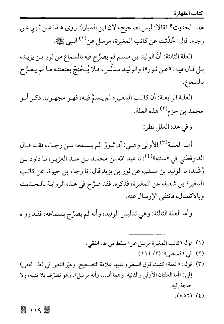 أما العلة (¬٣) الأولى وهي: أن ثورًا لم يسمعه من رجاء، فقد قال الدارقطني في "سننه" (¬٤): نا عبد الله بن محمد بن عبد العزيز، نا داود بن رُشَيد، نا الوليد بن مسلم، عن ثور بن يزيد قال: نا رجاء بن حيوة، عن كاتب المغيرة بن شعبة، عن المغيرة، فذكره. فقد صرَّح في هذه الرواية بالتحديث وبالاتصال، فانتفى الإرسال عنه.