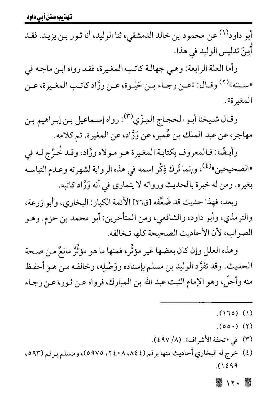 وأما العلة الرابعة: وهي جهالة كاتب المغيرة، فقد رواه ابن ماجه في "سننه" (¬٢) وقال: "عن رجاء بن حَيْوة، عن ورَّاد كاتب المغيرة، عن المغيرة".